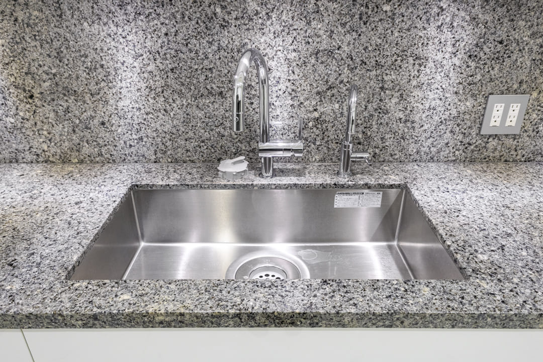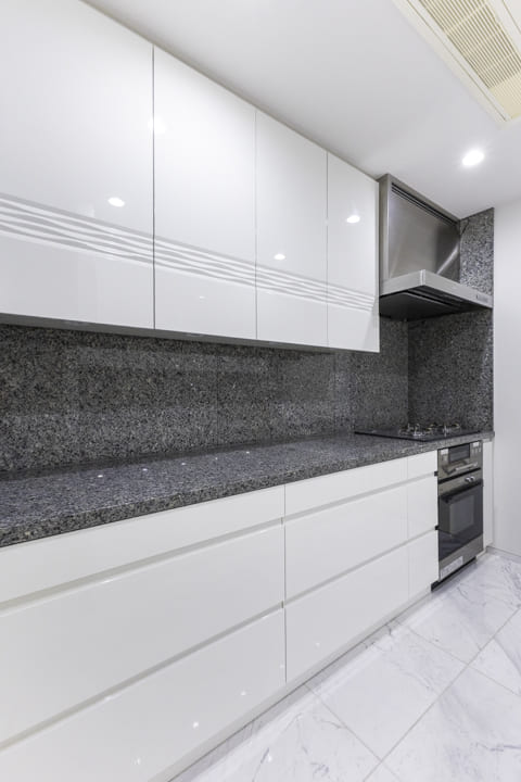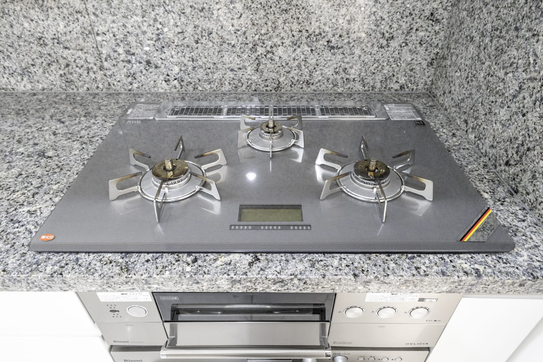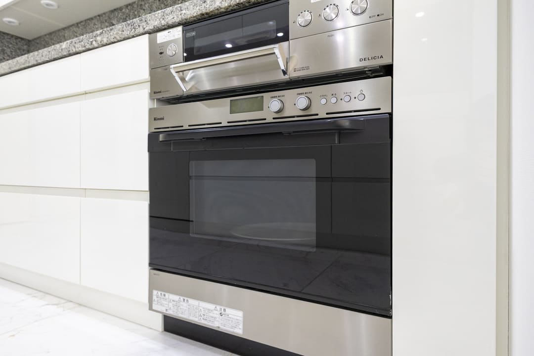作業スペースと収納を効率よく配置したⅡ型レイアウトで、設備も充実しています。グリル付3口ガスコンロとオーブンを備え、同時調理にも対応。後片付けの時短が叶う、AEG製の大型食洗機も内蔵されています。さらに、シンクにはディスポーザーを搭載。料理後すぐに生ゴミを処理できるので、掃除の手間が軽減され、悪臭の原因を防いでくれます。