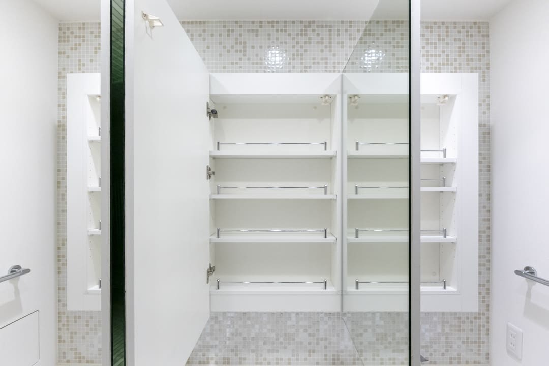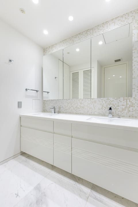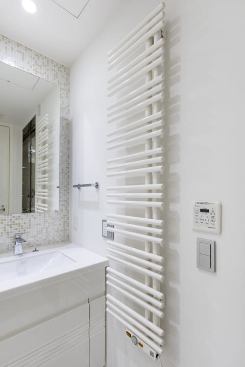 白を基調とした、清潔感あふれる洗面室。石目調タイルやモザイクタイルのバックガードが、空間にさりげない上質感を添えています。洗面化粧台はゆとりある2ボウル仕様で、忙しい朝も並んで身支度が可能です。ミラーボックスやリネン庫など収納も充実しており、生活感を抑えた整った空間を保てます。さらにタオルウォーマーを備え、入浴後には温かなタオルに包まれる心地よさを。室内をやわらかく温める効果も期待できます。
