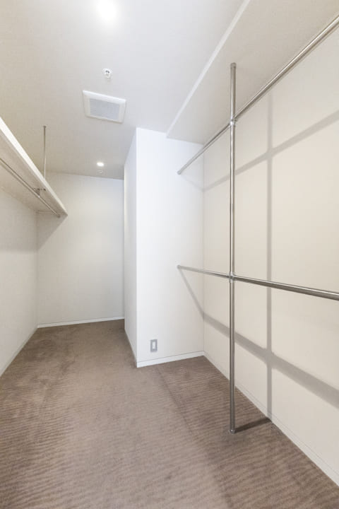 約4.7帖のWIC(ウォークインクローゼット)を備え、収納力◎。衣類はもちろん、トランクケースやゴルフバッグといった大きな荷物も収納でき、居室空間を有効活用できます。ハンガーパイプが2段になっていて、丈の短い洋服を効率良く収納できるのも嬉しいポイントです。