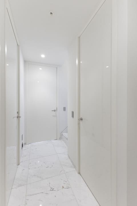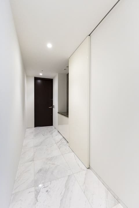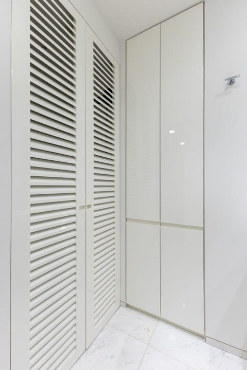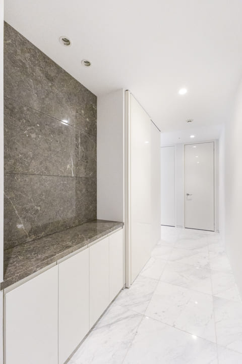 フルフラットで整えられた、ホテルライクな玄関ホール。人感センサー付照明を備え、夜遅い帰宅時もやわらかな光が足元を照らします。荷物で手が塞がっている際にもスムーズに出入りできる配慮がなされています。カウンタータイプのシューズボックスに加え、突き当たりには約0.8帖のSIC(シューズインクローゼット)を設置。靴類をすっきりと収め、整った玄関空間を保つことができます。