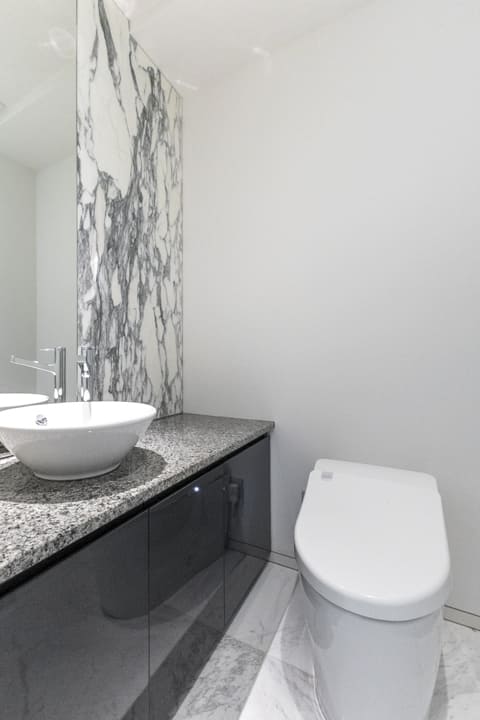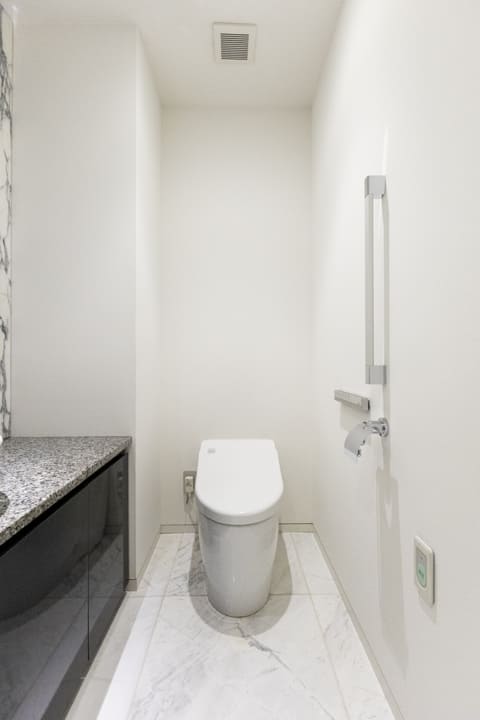 レストルームは各階に設けられ、シーンに応じた使い分けが可能です。2階のトイレは玄関に近く、来客時にもスムーズにご案内できる配置。1階はプライベート用として、ご家族での使用に適しています。いずれもタンクレストイレを採用し、すっきりとした印象に。独立した手洗いカウンターも備え、清潔感のある空間に整えられています。