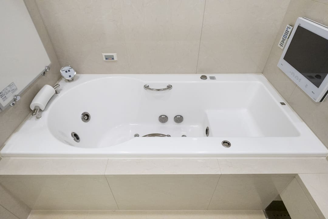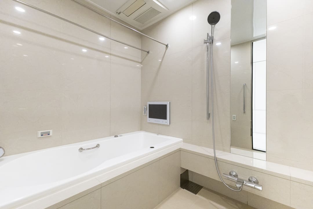 ゆったり入浴できる1822サイズのバスルーム。jaxson製の浴槽にはヘッドレストやステップを備え、自然な姿勢で寛げる設計です。ジェット&ブロア機能により、きめ細かな気泡が全身をやさしく包み込み、日々の疲れを心地よく解きほぐします。浴室換気乾燥暖房機や追い焚き機能、浴室テレビも完備し、季節を問わず快適な入浴時間をお楽しみいただけます。