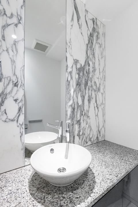 足元には光沢のある石柄フロアを採用。空間に上質な印象と広がりをもたらします。床暖房も備えており、冬場も足元から穏やかに温まる快適な居住性を実現しています。