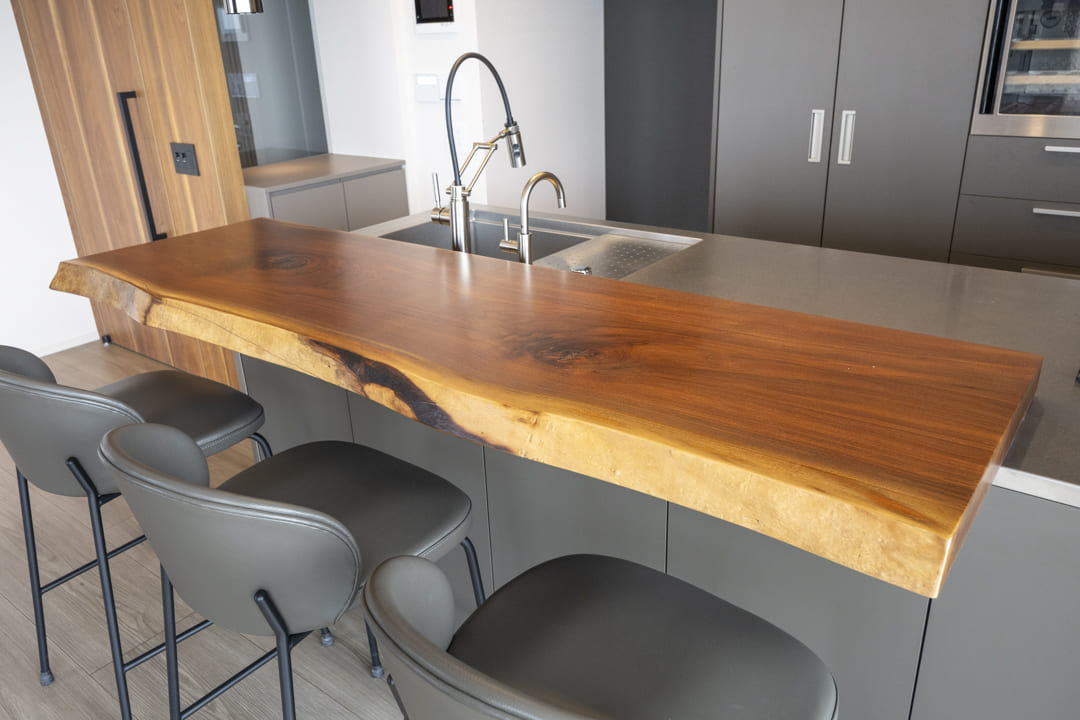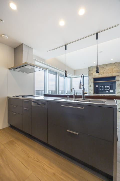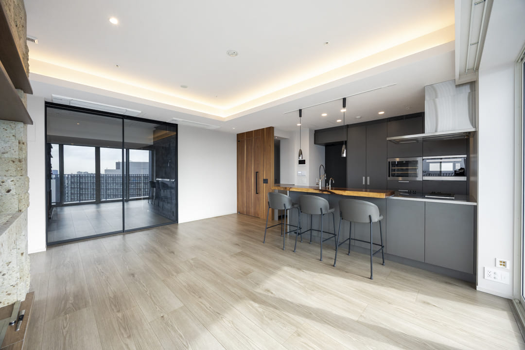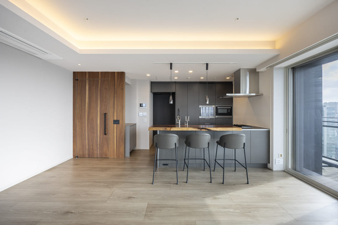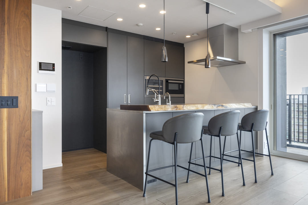 kitchenhouse製のオーダーキッチン。シックなデザインに、ウォールナットの無垢一枚板カウンターが美しく映えます。リビングダイニングを見渡せる対面タイプのため、ダイニングテーブルとしてはもちろん、バーカウンターのように使用することも可能。住まいの中心として、上質な時間を演出します。