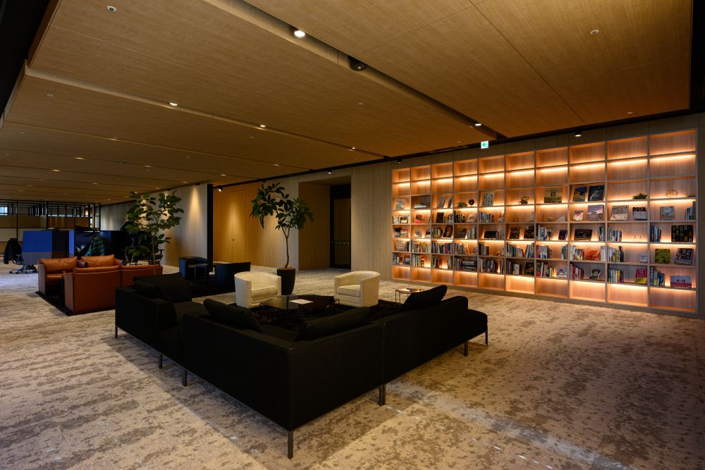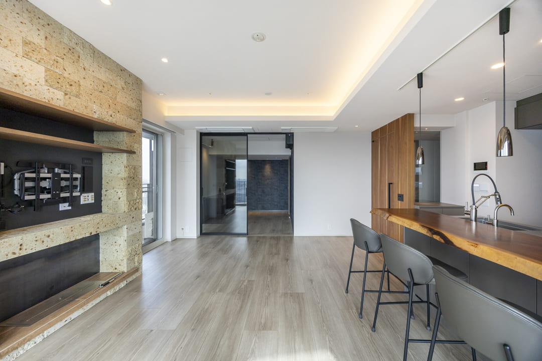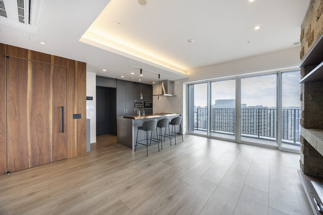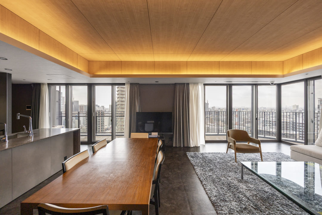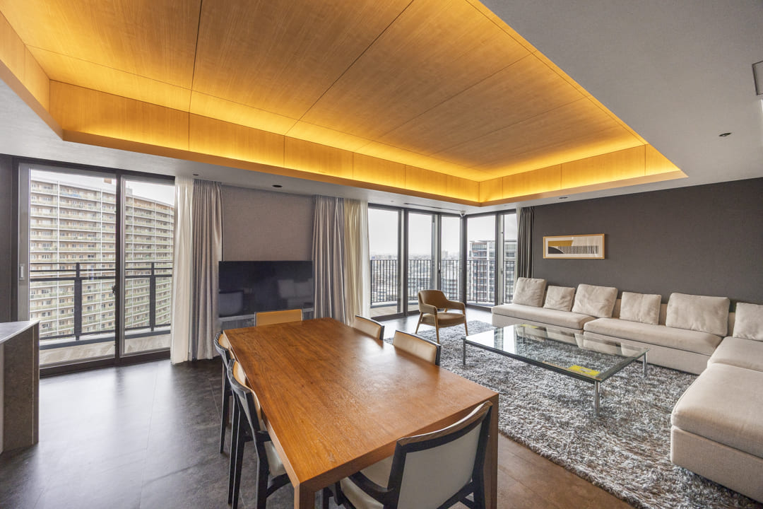 2面採光のゆとりあるリビングダイニング。南東・南西向きにつき、あたたかな陽光がたっぷりと降り注ぎます。さらに、富士山や東京湾、横浜港を望むダイナミックなパノラマビューも魅力のひとつ。開放感あふれる空間で、心ほどけるひとときをお過ごしいただけます。天井には間接照明を配し、やわらかな陰影が広がることで、空間全体に上品な雰囲気をもたらします。また、リビングドアにはウォールナットの突板を採用。空間のアクセントとなり、木の温もりをさりげなく添えています。