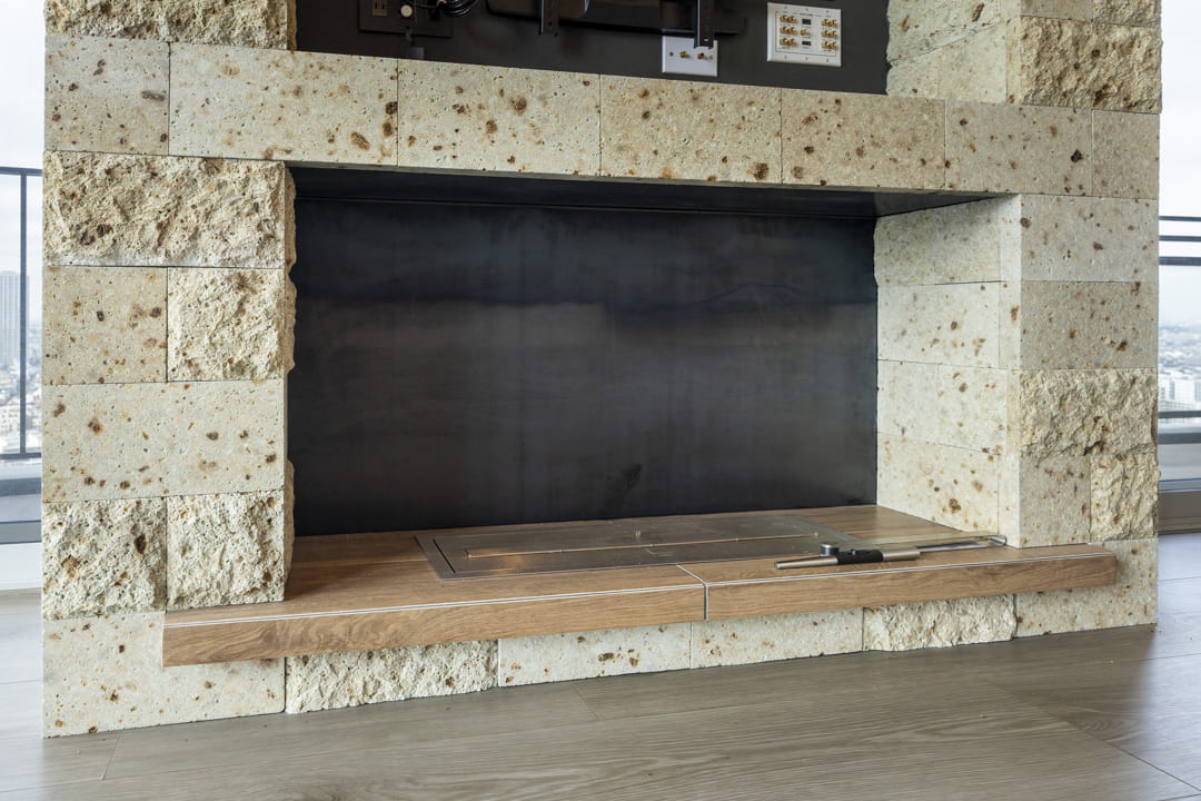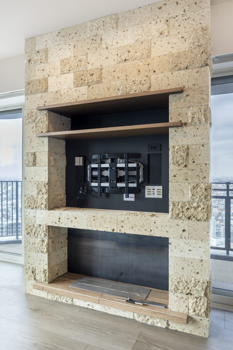 リビング正面には、EcoSmart社製のバイオエタノール暖炉を設置。大谷石をあしらったマントルピースが、連続する窓面に豊かな表情を添えています。上部はTVボードとして活用でき、空間をすっきりと整えられるのも嬉しいポイントです。