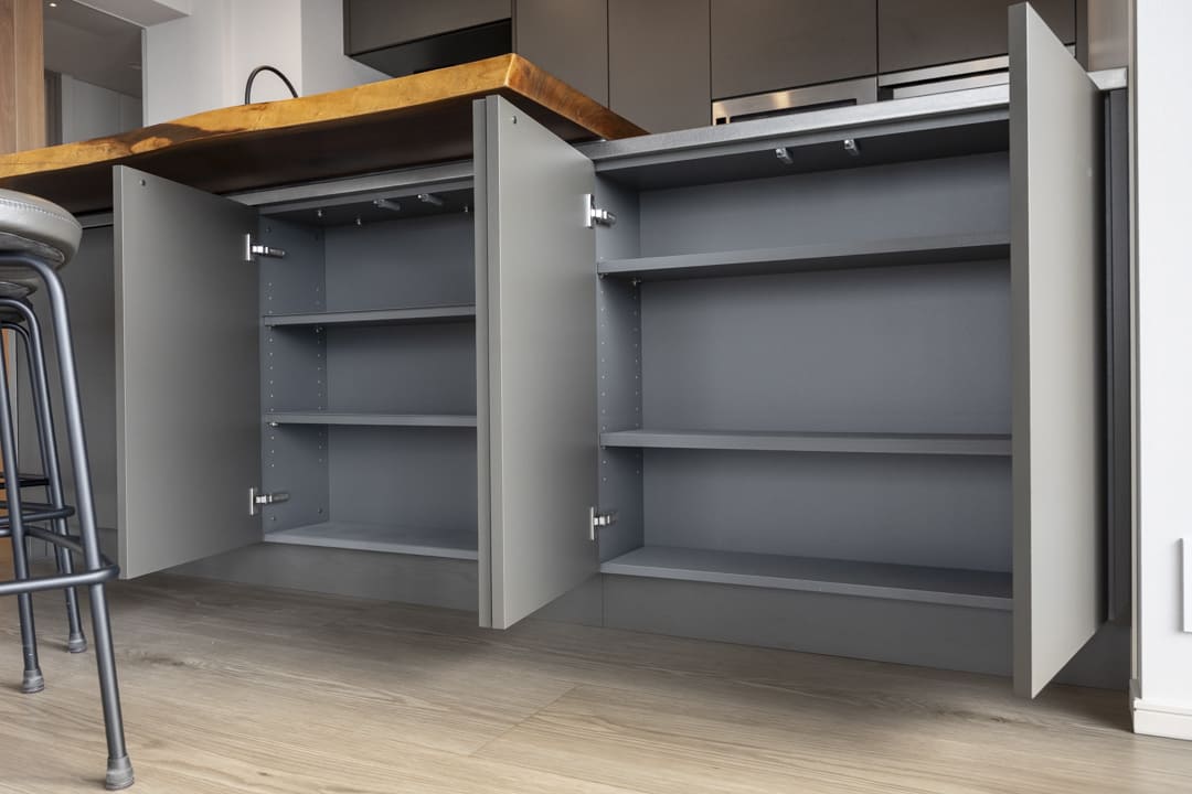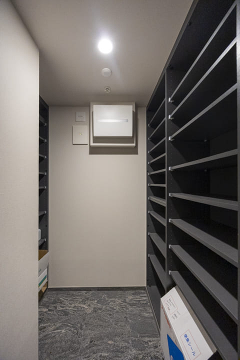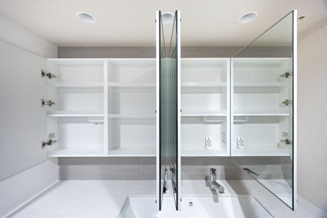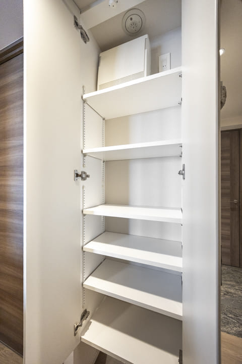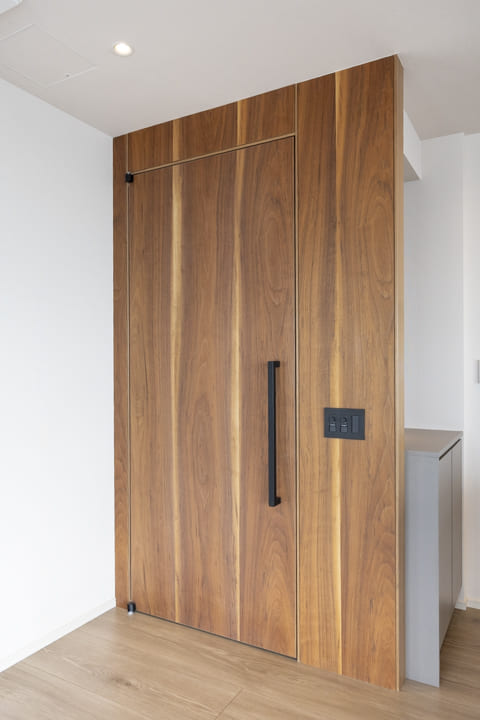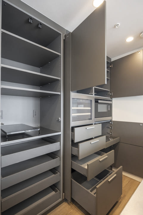 背面にはキッチンと意匠を揃えたカップボードを設置。食料品や食器類をすっきりと収めることができ、生活感を抑えた美しい空間を保つことができます。さらに、リビング側にも戸棚を備え、用途に応じた収納を確保。住まい全体の整然とした印象を支えています。