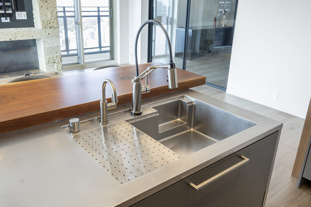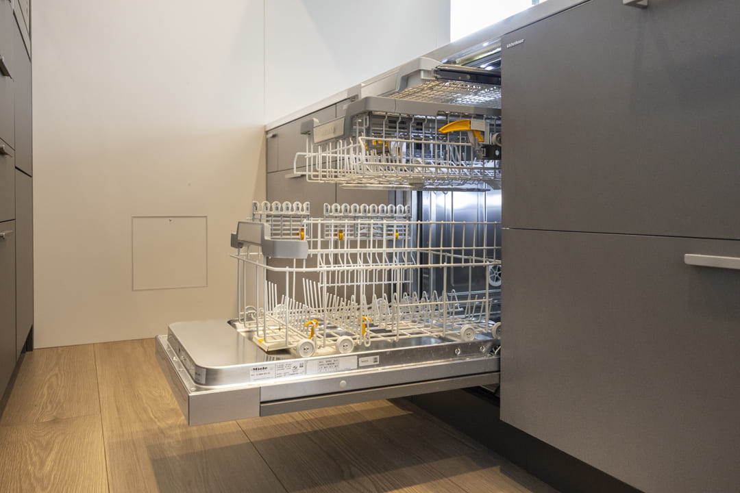 Miele製の大容量食洗機を内蔵し、後片付けの負担を軽減。さらに、シンクにはディスポーザーを設置しています。生ごみ処理の手間を抑え、キッチンを清潔に保ちやすい環境が整っています。