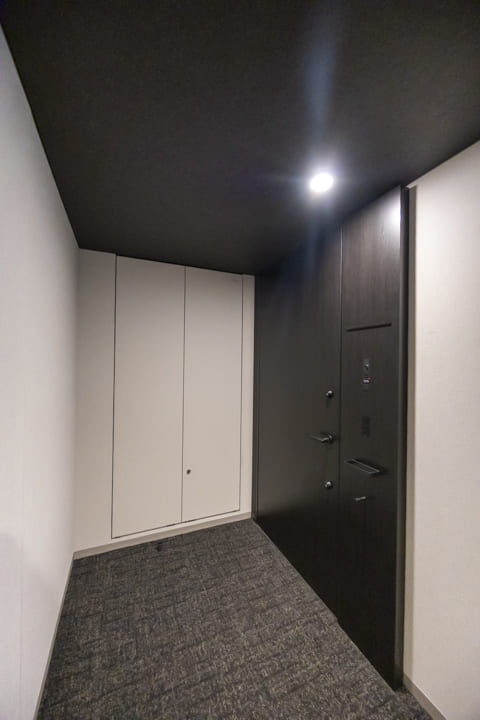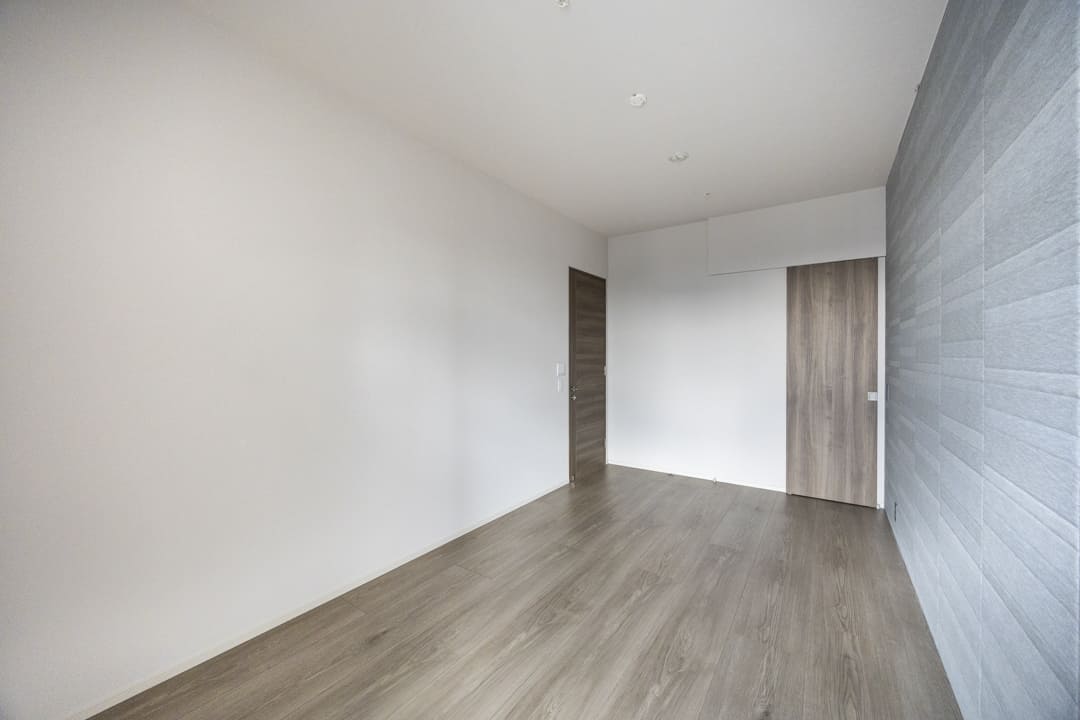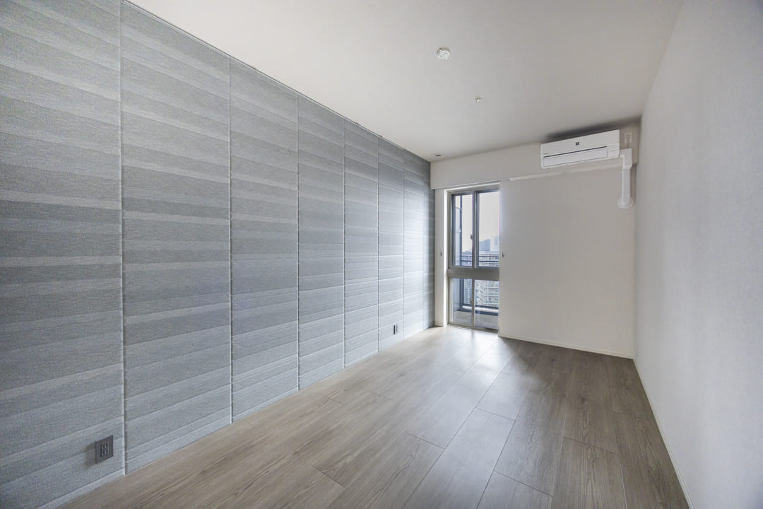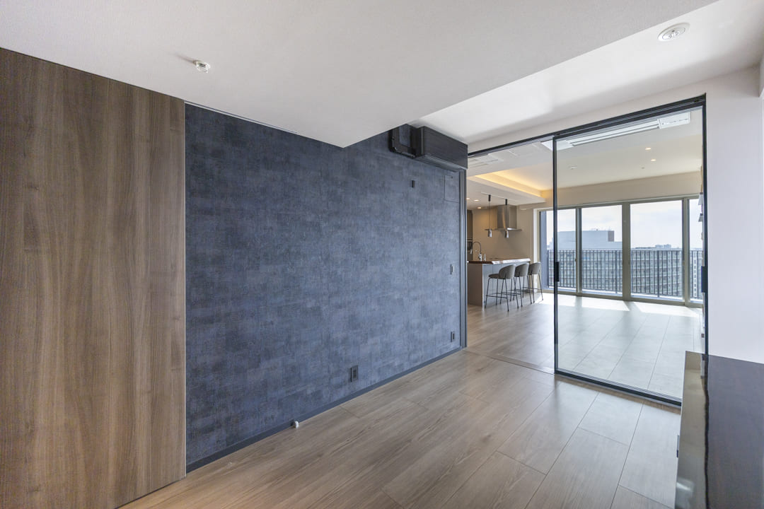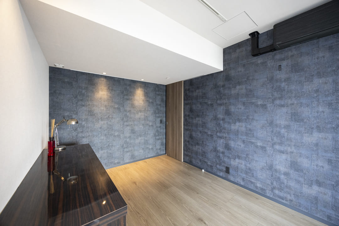 LDKに隣接する洋室1には、ガラス引き戸を採用。ガラス越しに家族の気配を感じながらも、仕事や趣味に穏やかに向き合える空間です。グレーを基調とした壁紙やブラックのエアコンが空間を引き締め、さりげないこだわりを感じさせます。WIC(ウォークインクローゼット)を備え、収納力も充分。居室部分をすっきりと広くお使いいただけます。