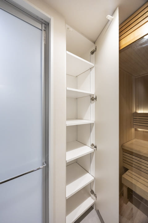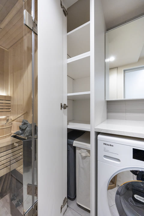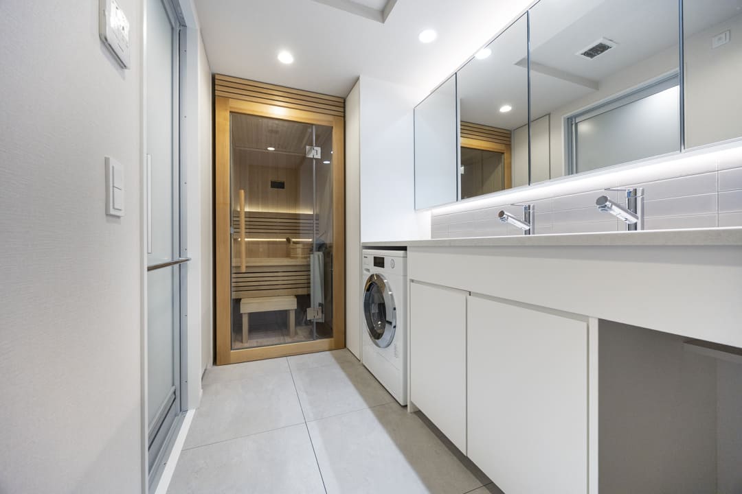 洗面室の奥には、最高温度100℃・ロウリュ対応の本格仕様サウナを設置。ご自宅にいながら、好きな時間に心ゆくまでサウナをお楽しみいただけます。周囲を気にすることなく、自分だけのリラックスタイムを叶える贅沢な空間です。