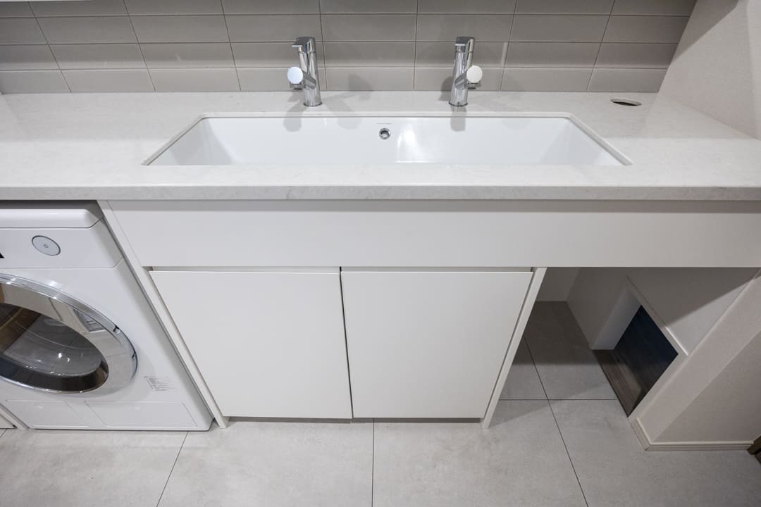 白を基調とした、清潔感あふれる洗面室。タイル貼りのバックガードと間接照明がホテルライクな雰囲気を演出します。水栓が2つ並ぶゆとりある洗面ボウルを採用し、2人同時の使用にも対応。忙しい朝の身支度も、ゆとりをもって行える設計です。カウンター下には椅子を収められ、座って落ち着いて身支度ができるのも魅力です。洗面台本体の収納に加え、リネン庫も2つ備え、収納スペースも充実。さらに、Miele(ミーレ)製のドラム式洗濯乾燥機を完備し、日々の家事負担の軽減にも配慮されています。