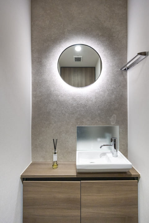 廊下に面した、独立性の高いレストルーム。TOTO製のスタイリッシュなタンクレストイレを採用しています。正面には、丸いミラーが印象的な手洗いカウンターを設置。ホテルライクな空間に仕上げられており、ゲストを洗面室へ案内することなくお使いいただける設計です。