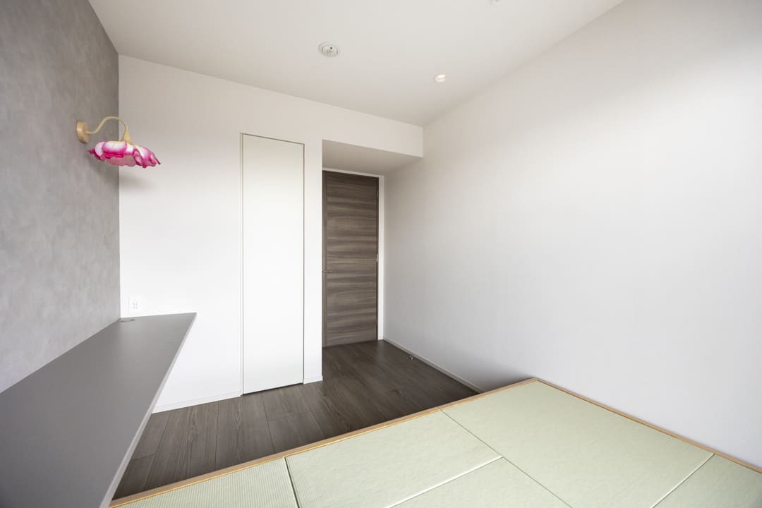 南東向きで日当たりと眺望に恵まれた洋室3。畳の小上がりを設えた、和の趣を感じる空間です。腰を掛けたり、横になったりと多用途に活用でき、くつろぎの場としても重宝します。窓の先には開放的な景色が広がり、時間帯によって移ろう空を身近に感じられるのも魅力のひとつ。壁面にはカウンターを備えており、ディスプレイやワークスペースとしても活用可能です。住まいの中に、ほっと心がほどけるひと部屋が用意されています。