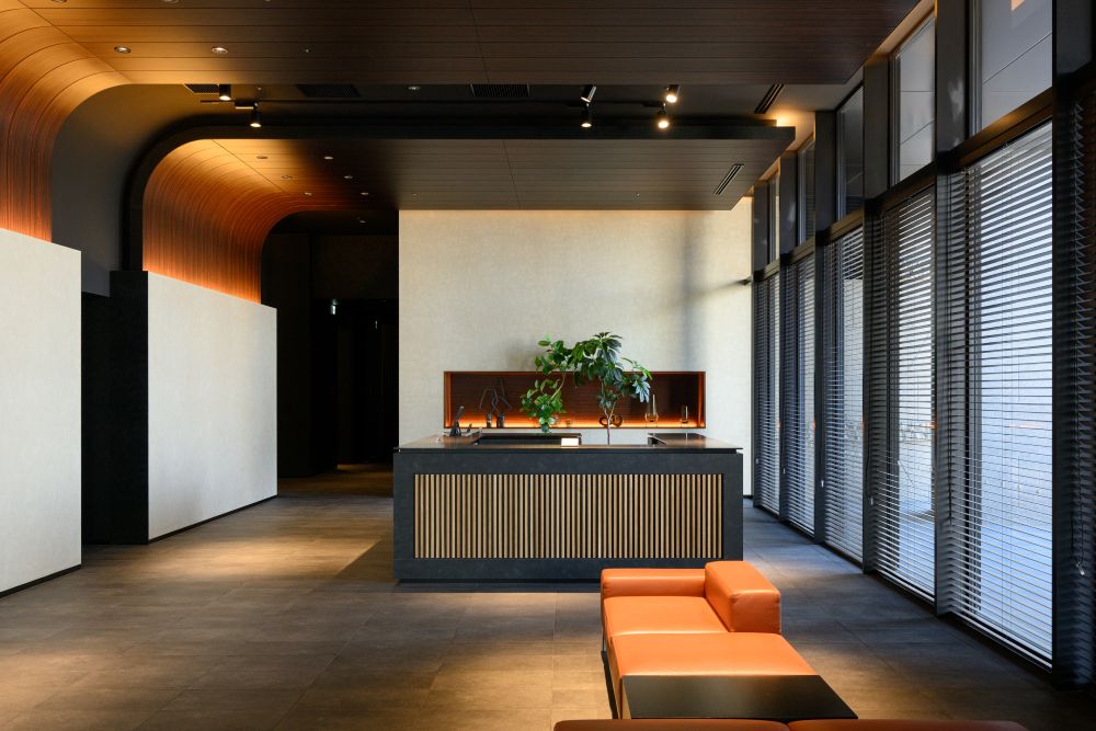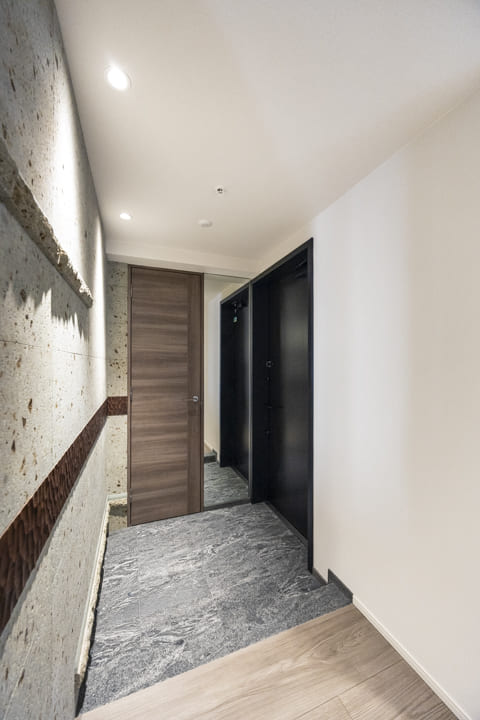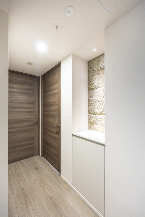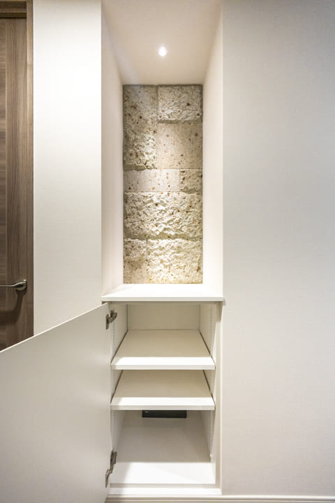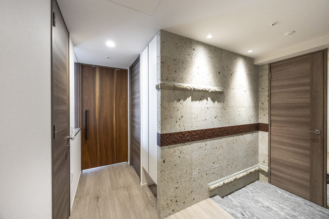 壁面に大谷石を採用した、重厚感の漂う玄関。スポットライトの光が陰影を描き、石の豊かな質感を際立たせます。手すりには無垢のウォールナットを用い、名栗(なぐり)仕上げを施した一本を壁面に沿って設置。温もりが感じられる、趣深い空間です。