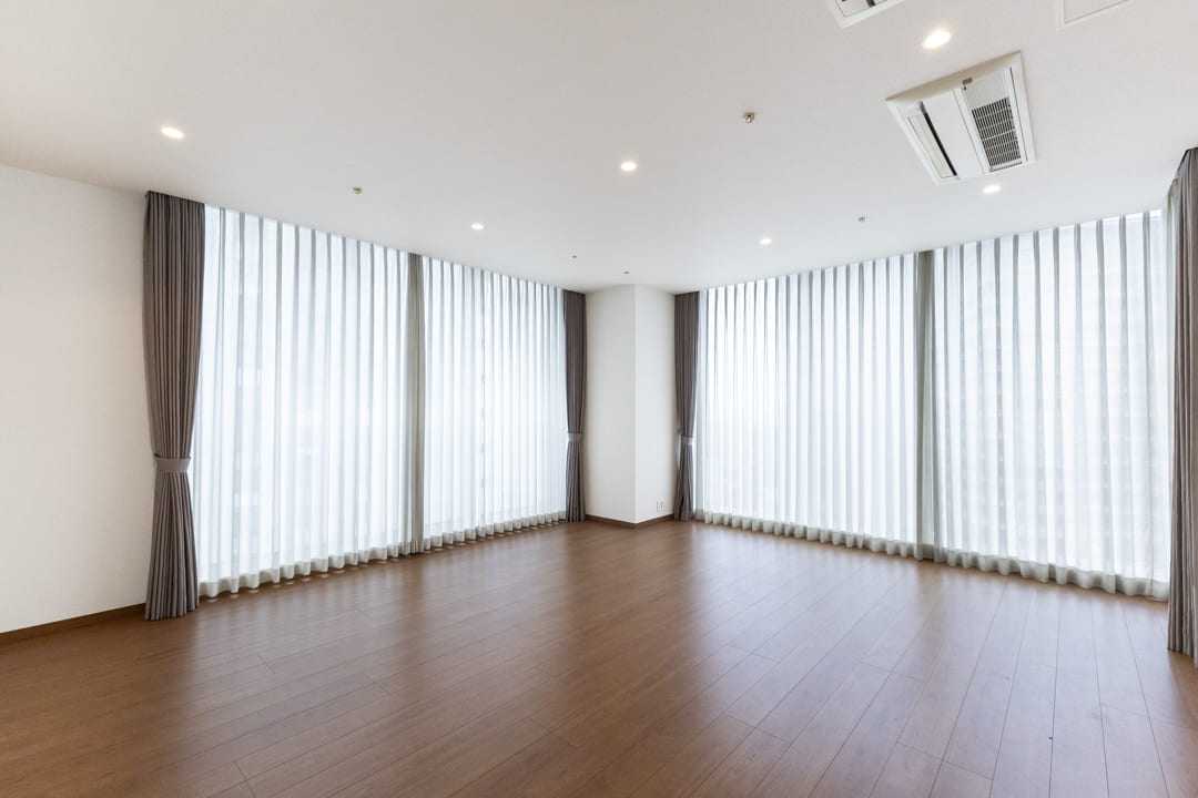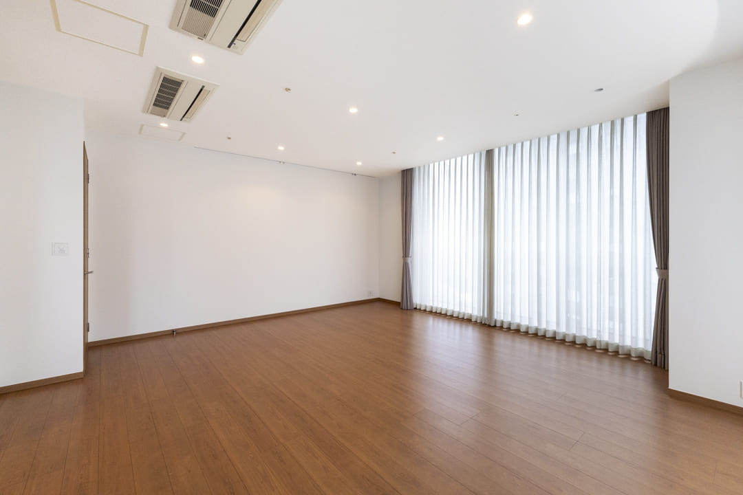 約17.7帖のリビングダイニング。2面に設けられたハイサッシから自然光がやわらかく差し込み、明るさを感じられる空間です。窓の外には都心らしいビル群が広がり、街の気配を身近に感じられるロケーション。ビルトインエアコンを採用し、天井まわりもすっきりとした印象に整えられています。木目フローリングを基調としたシンプルな内装で、さまざまなインテリアと調和しやすいのもポイント。現況引渡しですが、そのままでも心地よくお住まいいただける状態です。