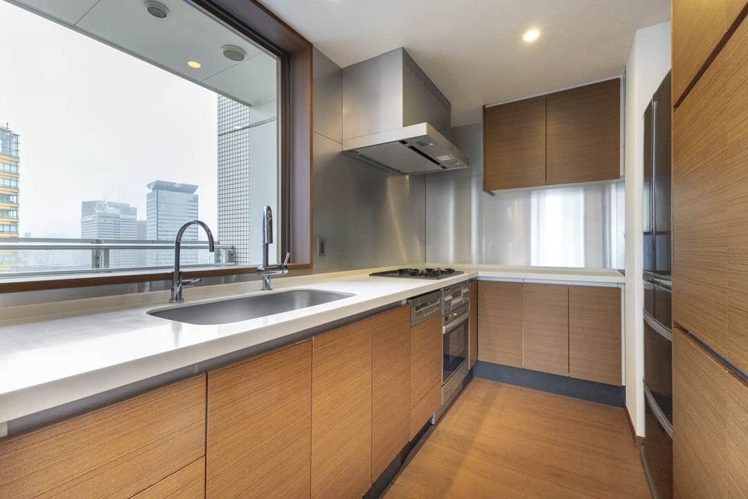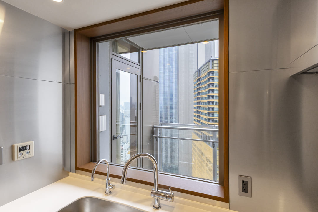 約4.8帖の独立キッチン。シンク前には大きな窓があり、こもり感がありながらも開放的な気分で作業ができます。生活感が出やすいキッチンまわりをさりげなく目隠しでき、調理中のにおいが生活スペースに広がりにくいのも嬉しいですね。ゆとりあるカウンターを備えたL型レイアウトで、作業動線が短く、効率良く動ける設計。複数人での調理もスムーズに行うことができます。