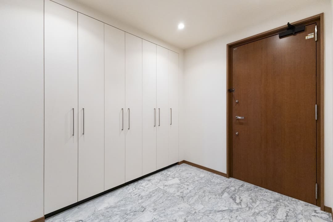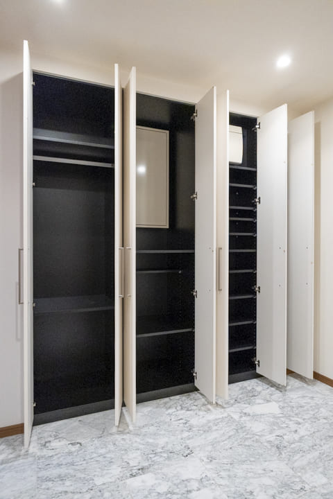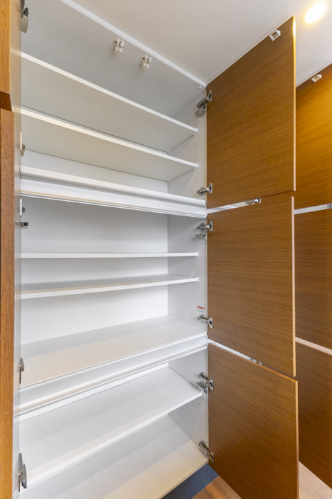 フルフラット仕様で広々とした玄関ホール。高級感の漂う石柄フロアを採用しています。大容量のシューズボックスを備え、散らかりがちな靴をすっきり収納可能。自由度の高い可動棚のため、雨具やペットグッズも収納できて便利です。