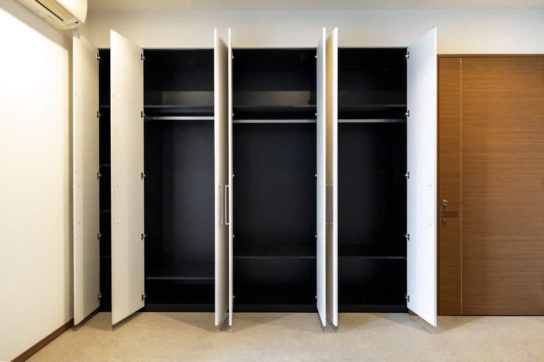 約9.3帖の洋室1は主寝室に。廊下の突き当たりに位置しているため独立性が高く、落ち着いて過ごせる空間です。ハイサッシからやわらかな自然光が差し込み、開放感たっぷり。梁や梁がないのも、広く感じられるポイントです。大容量のクローゼットを備え、収納スペースも充実しています。