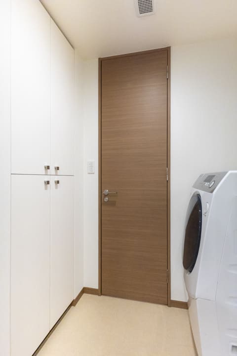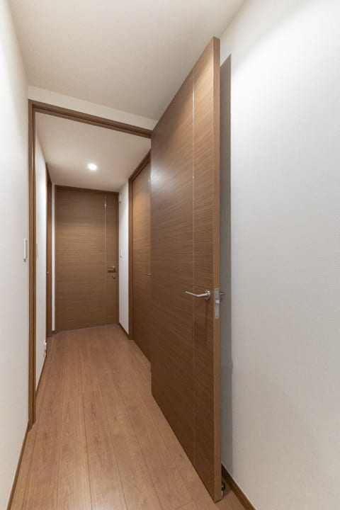 廊下には扉があり、パブリックスペースであるLDKと、寝室・洗面室といったプライベートスペースの空間分けがされています。家族との時間も一人の時間も大切にできる間取りで、ゲストを招いた時もお互い気を遣わずに過ごせそうです。