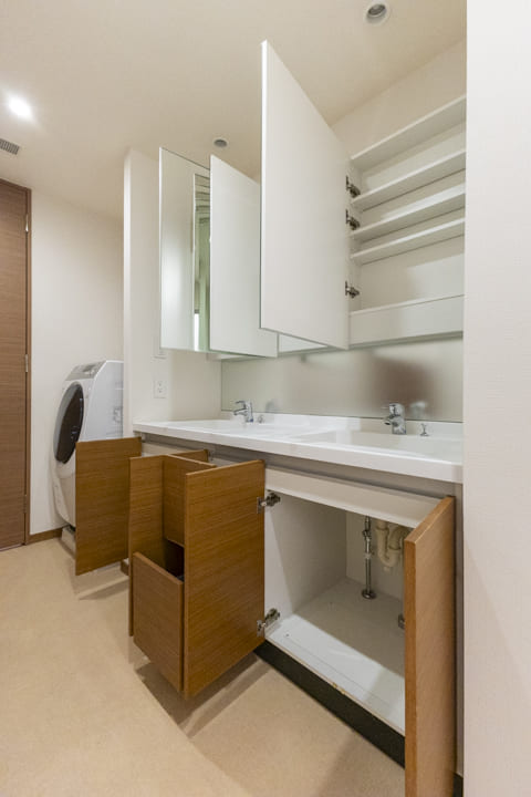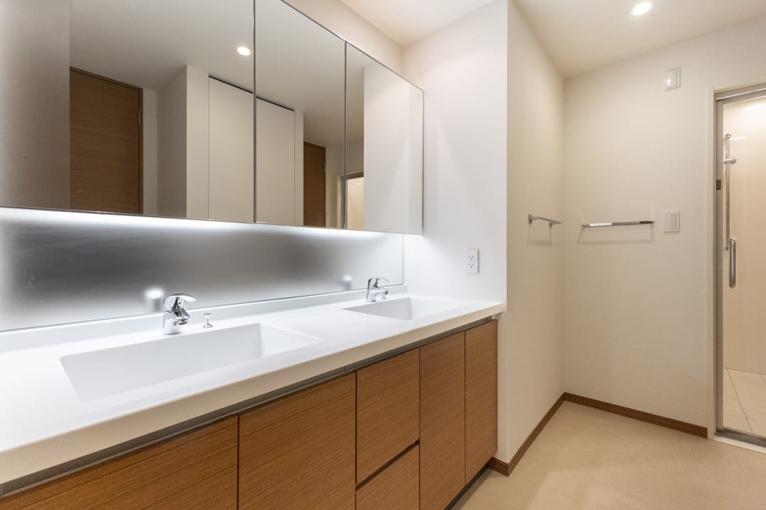 洗面室へは洋室1と廊下からアクセスでき、回遊性に優れた間取り設計です。広々カウンターが特徴的な2ボウル仕様の洗面化粧台を採用。2人並んで使用でき、忙しい朝の身支度も落ち着いて行うことができます。ミラーボックス・足元の収納に加え、大容量のリネン庫も完備。洗面まわりの小物からタオル・パジャマ類まですっきり収めることができます。