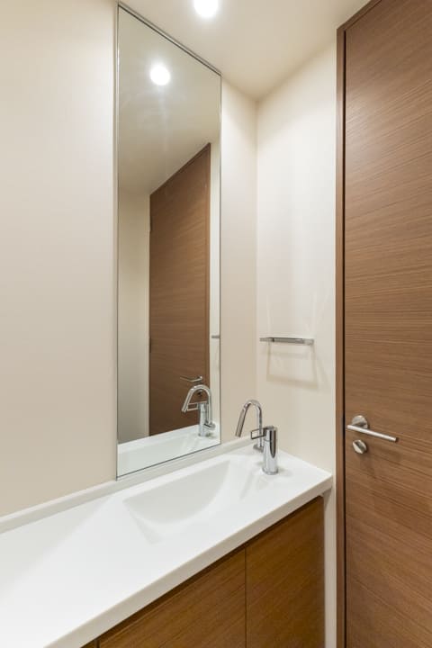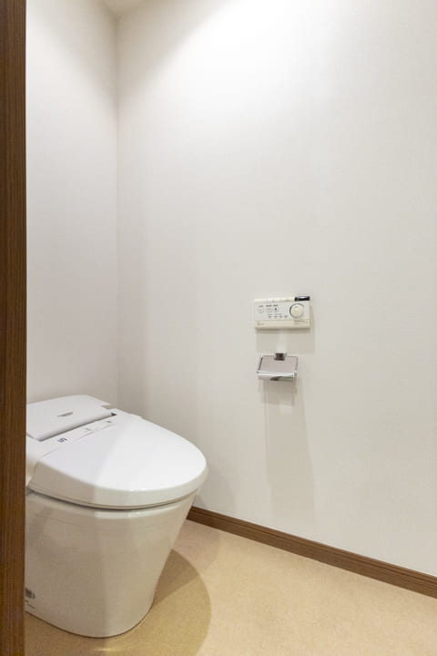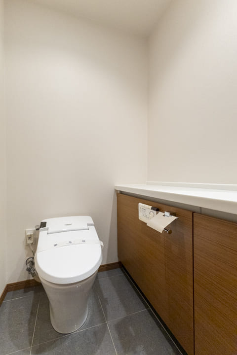 レストルームは2ヶ所に設けられ、シーンに応じた使い分けが可能。洗面室内にあるトイレは、ご家族のプライベート利用に適しています。もう一方は玄関近くにあり、独立性が高い空間。こちらには手洗いカウンターが備わっているため、ゲスト用としてもスマートにお使いいただけます。いずれもスタイリッシュなタンクレストイレを採用しています。