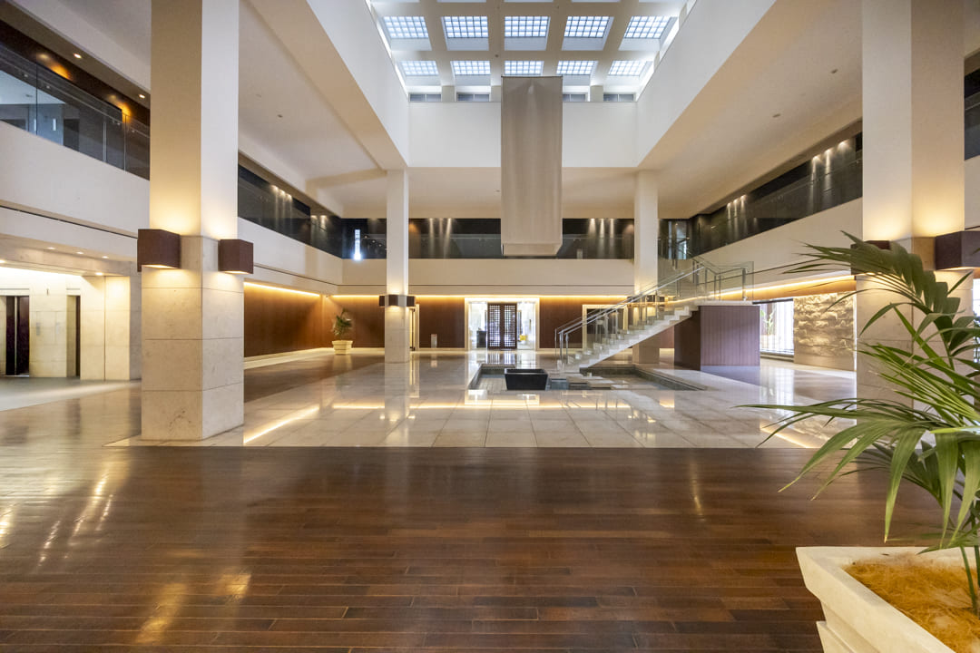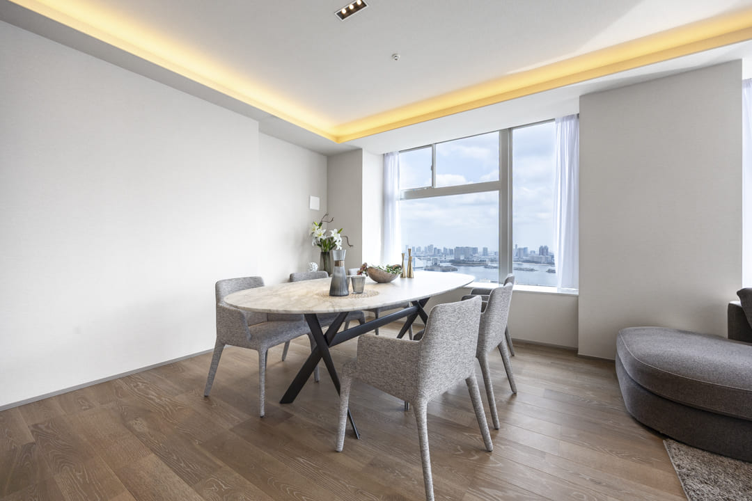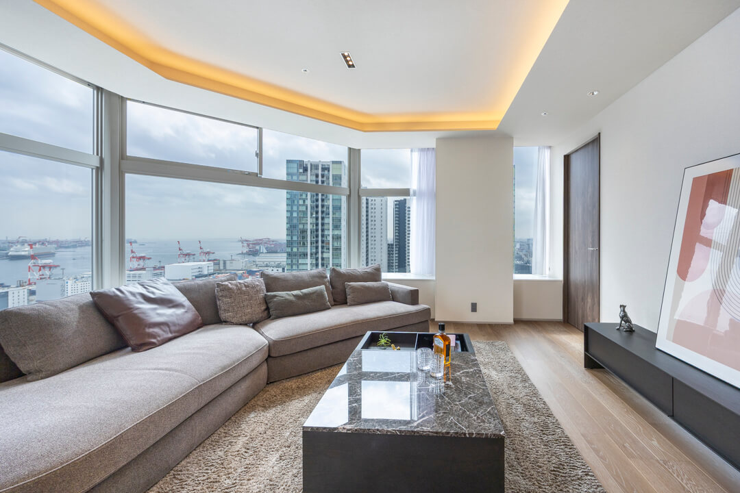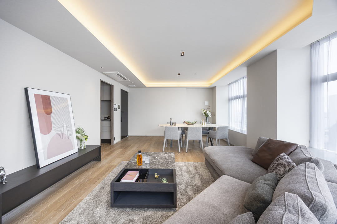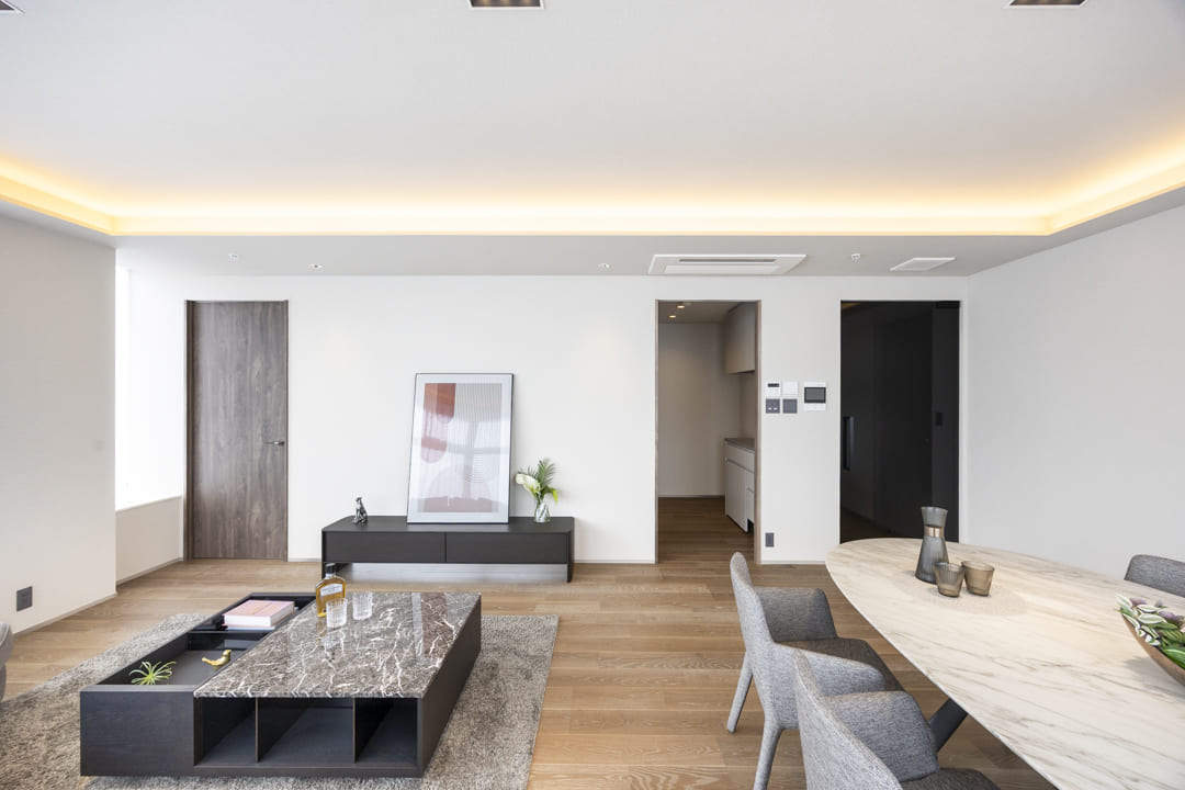 折り上げ天井と間接照明が空間に奥行きをもたらし、やわらかな光が上品な雰囲気を演出。自然な風合いが美しい木目フローリングが、洗練された中にも温もりを感じさせます。大きな窓からの景色と調和し、落ち着きと開放感を兼ね備えた空間に仕上げられています。