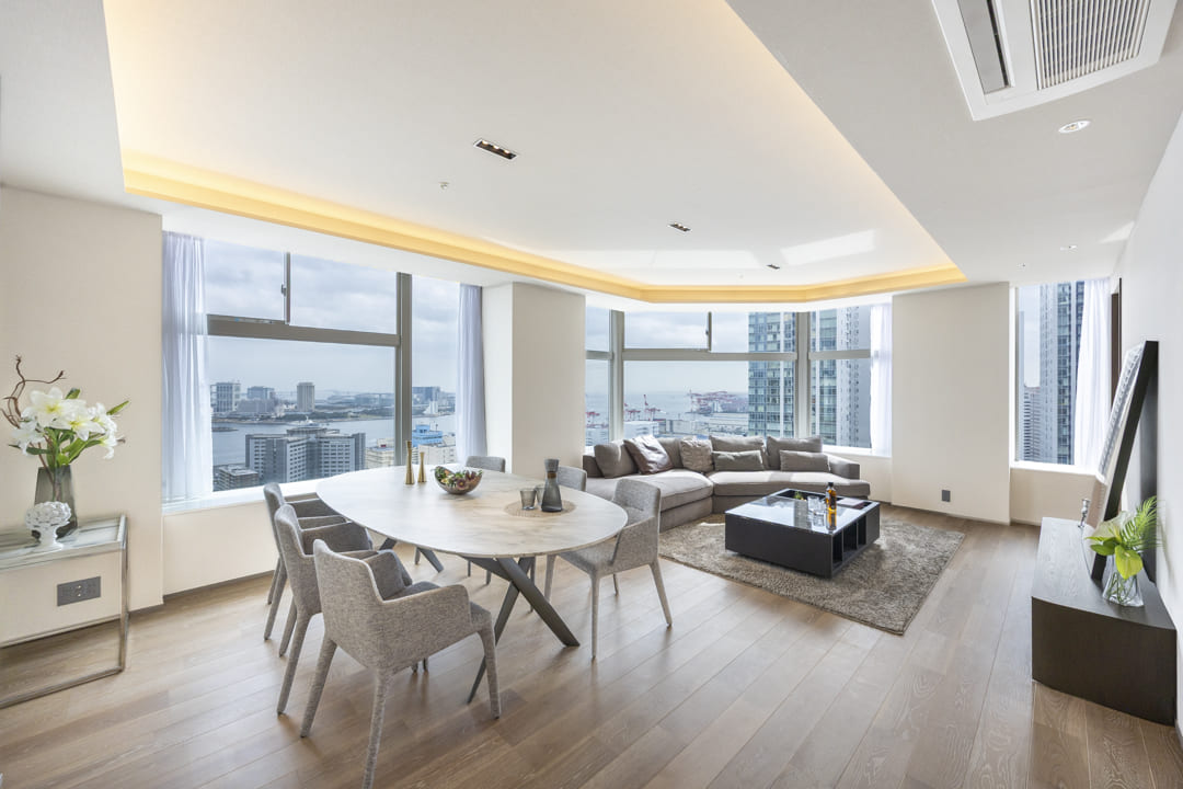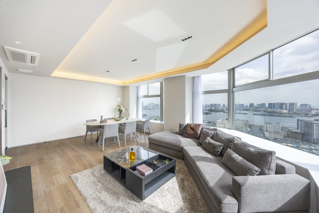 約23.5帖のゆとりあるLDK。南東向きの大きな開口部からはたっぷりと陽光が差し込み、室内に明るさと伸びやかな開放感をもたらします。コーナーにかけて連なる窓の先には運河と都心の景色が広がり、北東側にはレインボーブリッジを望む贅沢な眺望。高層階ならではのパノラマビューが、日常を特別な時間へと昇華させます。