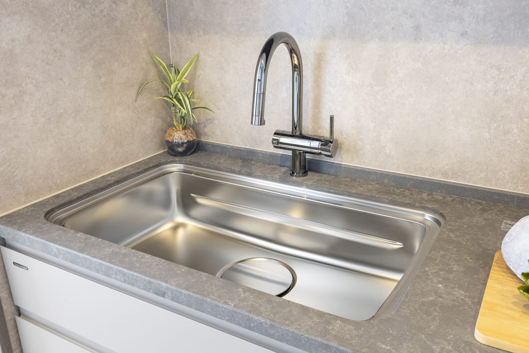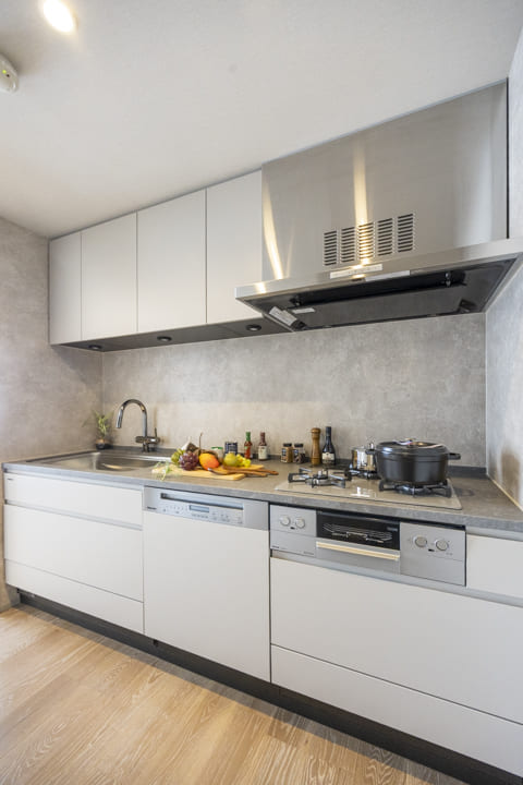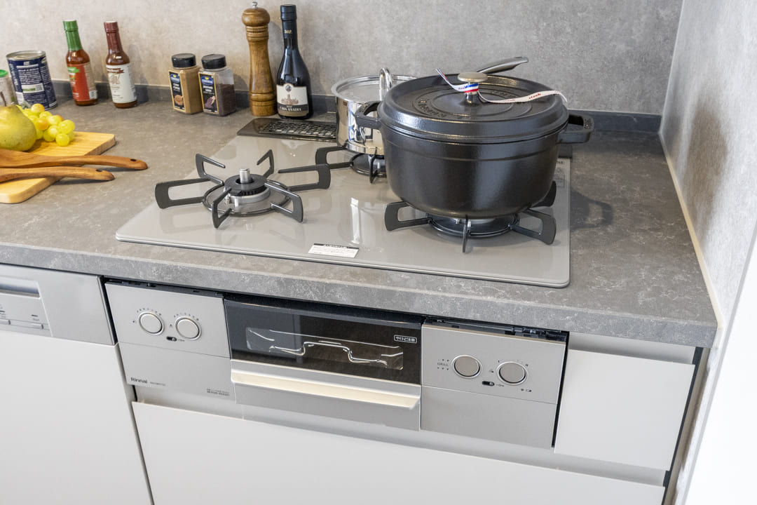 同時調理の叶うグリル付3口ガスコンロを搭載。調理効率が上がり、料理のレパートリーも増えそうです。容量の大きさが魅力的なMiele(ミーレ)製食洗機も内蔵されているため、後片付けが捗り、節水効果も期待できます。