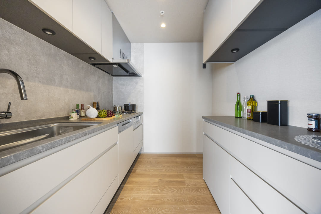 生活空間から程よく切り離された独立型キッチンは、落ち着いて調理に集中できる上質な設計。石調カウンターが重厚感を添え、空間全体に洗練された印象をもたらします。キッチンまわりの生活感をさりげなく抑えられるほか、調理中のにおいがリビングへ広がりにくいのも魅力です。