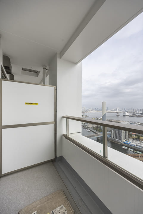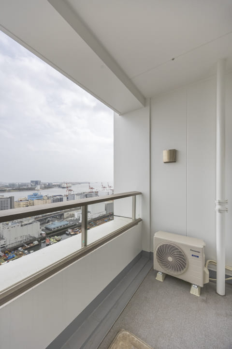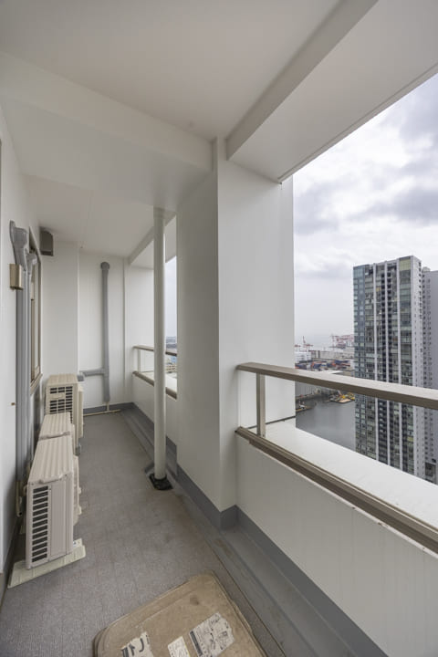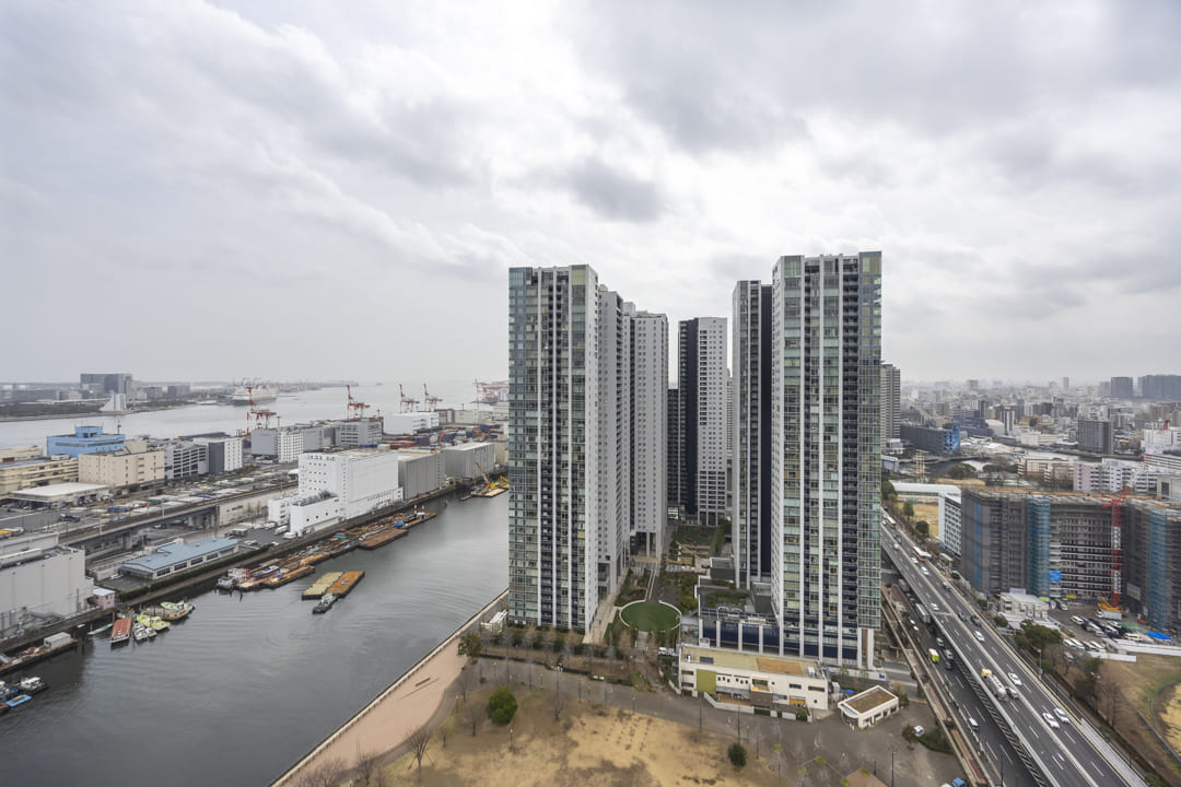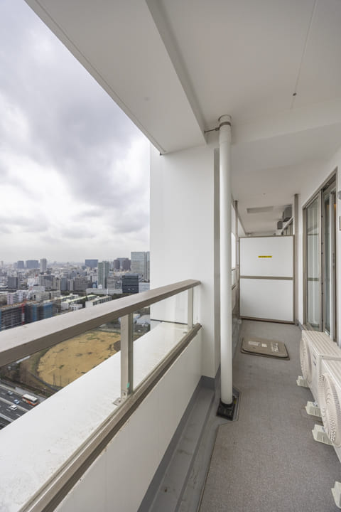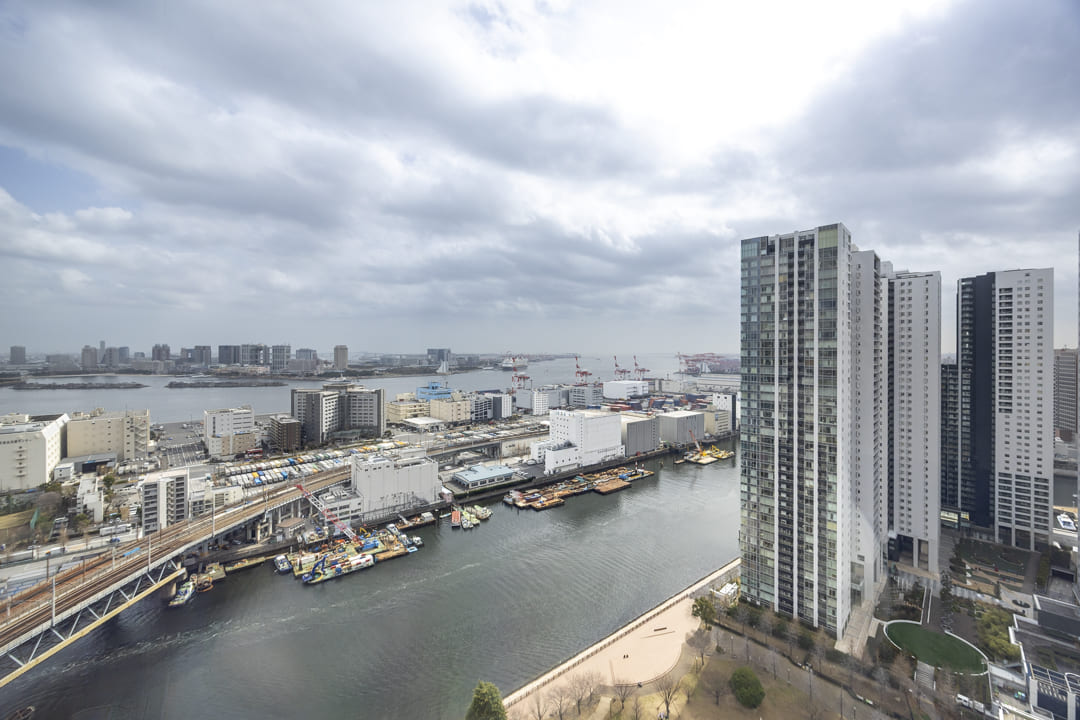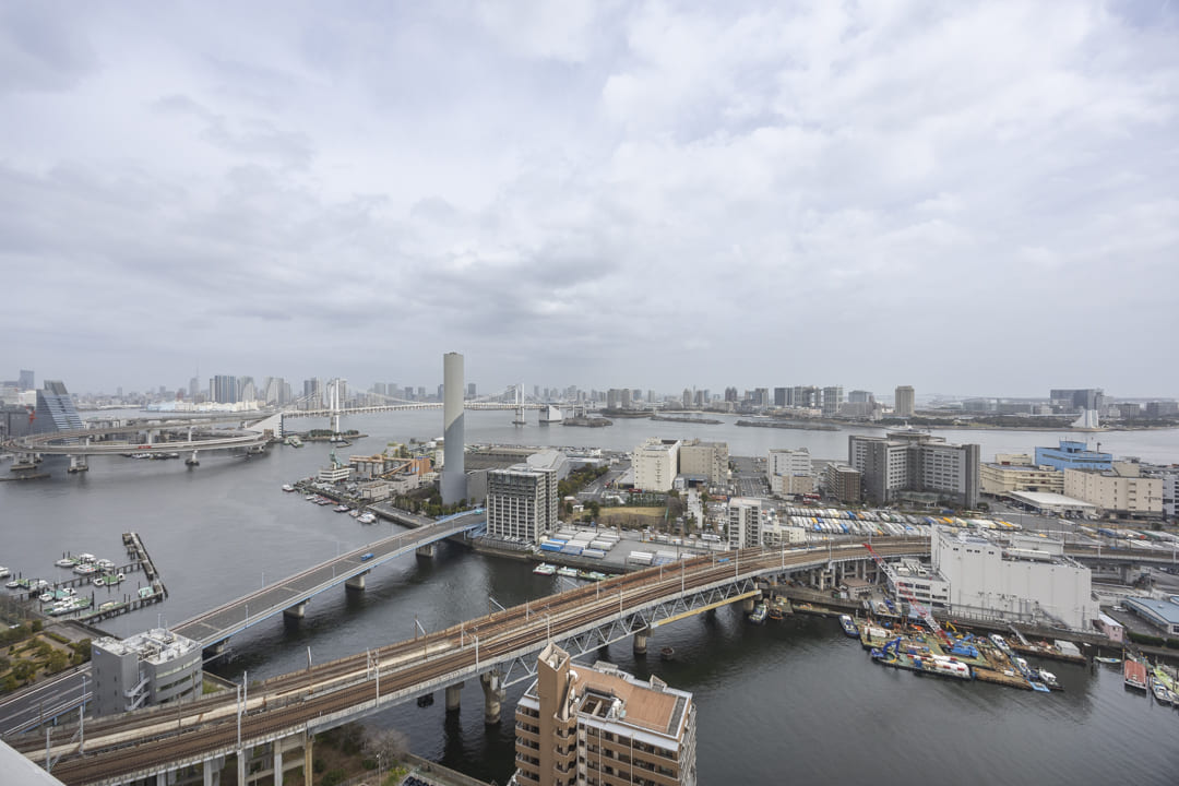 バルコニーは南・東の2面に設けられ、陽光に恵まれた心地よい空間です。31階部分ならではの開放感が広がり、眺望も良好。撮影日はあいにくの空模様でしたが、晴れた日には遠くまで広がる青空と運河の眺めをお楽しみいただけます。北東側にはレインボーブリッジを望み、夜にはきらめく景色も堪能できそうです。