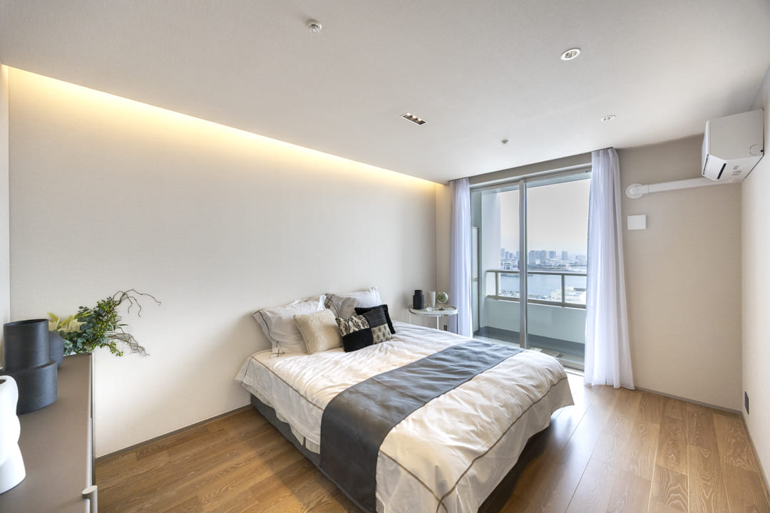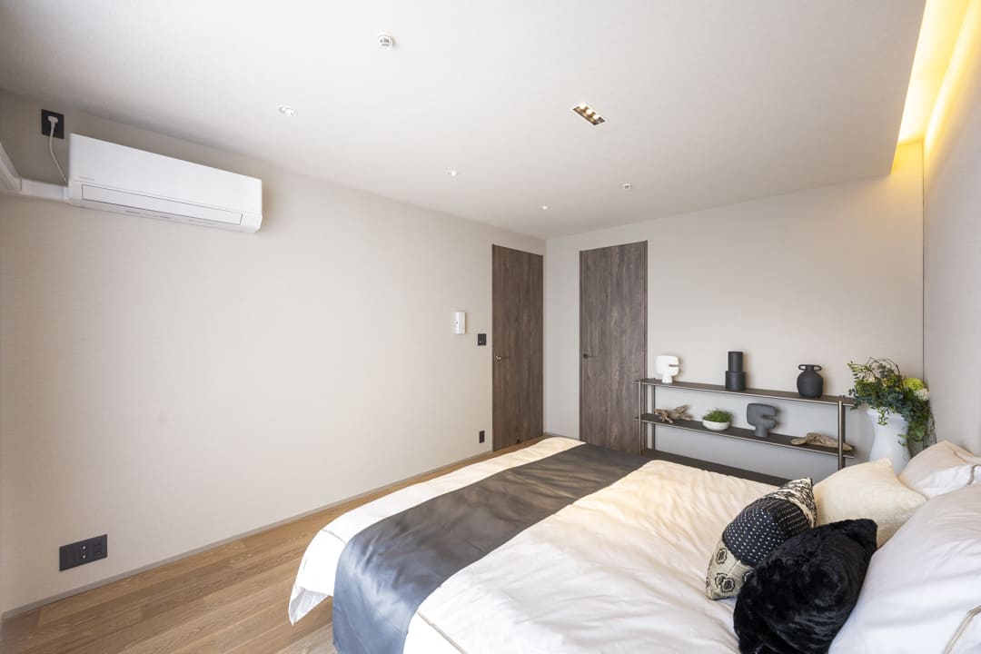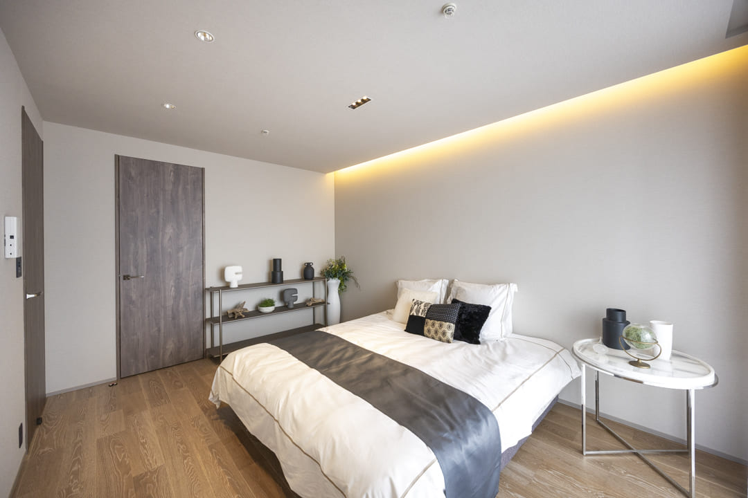 約8.4帖のゆとりある主寝室。東向きバルコニーに面しているため、朝日を浴びて爽やかな朝を迎えられそうです。天井には間接照明を配し、やわらかな光が空間に奥行きと上質感を添える設計。インターホンが設置されていて、急な来客時にリビングまで行く手間がかからないのも嬉しいポイントです。