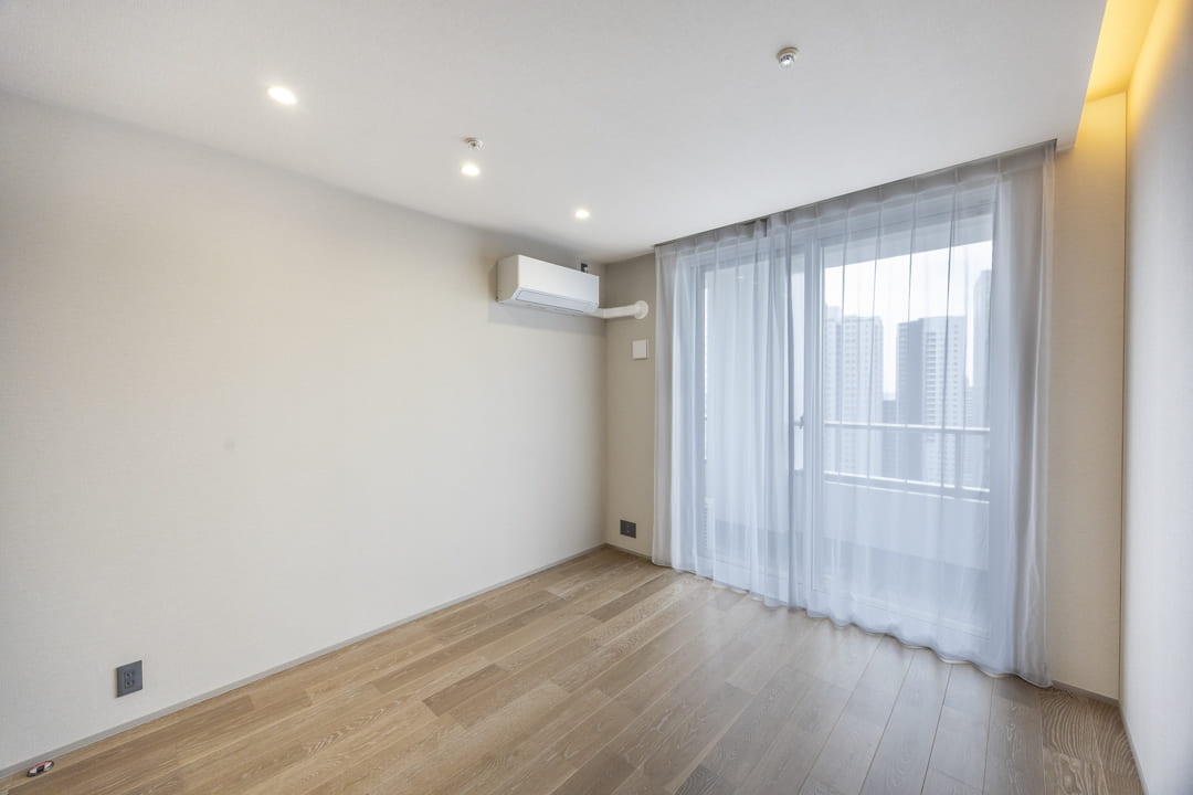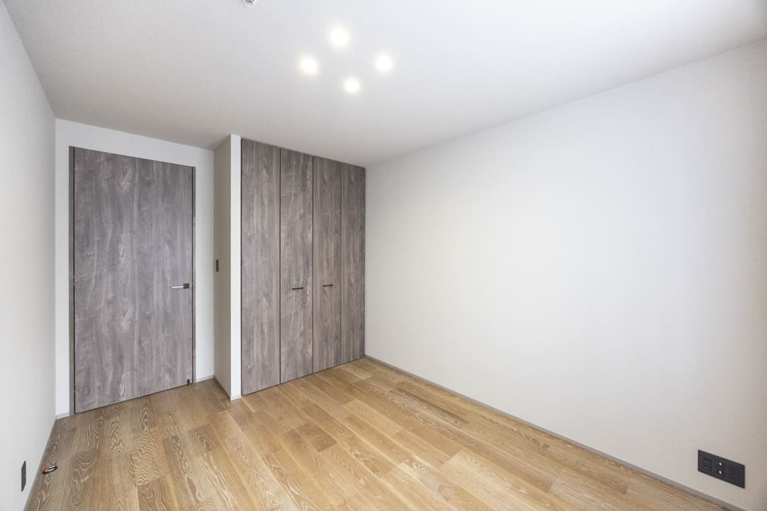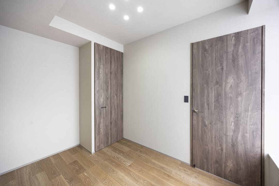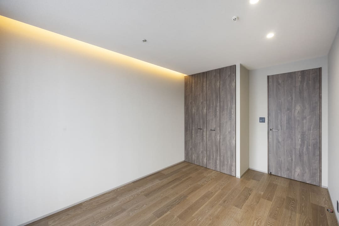 玄関を入って最初に広がるのが、約7.0帖の洋室1。南向きバルコニーに面し、明るさと開放感を享受できる心地よい空間です。間接照明を点ければ、空間の表情がやわらかく変わり、リラックスタイムへと誘います。4枚折れ戸のクローゼットを備え、収納力にも配慮されています。