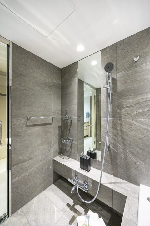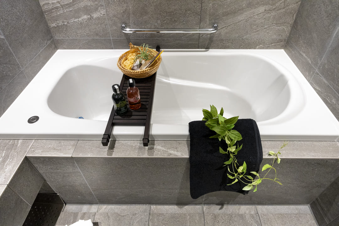 石調デザインで高級感の漂うバスルーム。なめらかな曲線のラウンドライン浴槽で、身体を包み込むような心地よさを感じることができます。換気・暖房・乾燥・涼風機能付きで1年中快適なバスタイムに。雨天時の洗濯乾燥や湿気対策にも配慮された仕様です。家族の入浴時間が異なる日や、ゆったりと半身浴を楽しみたい時に重宝する追い焚き機能も搭載されています。