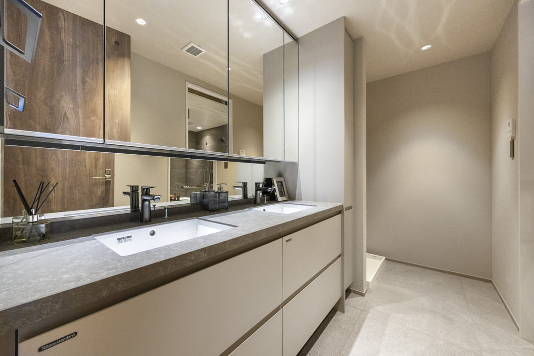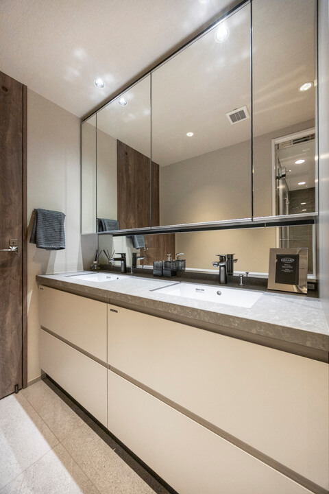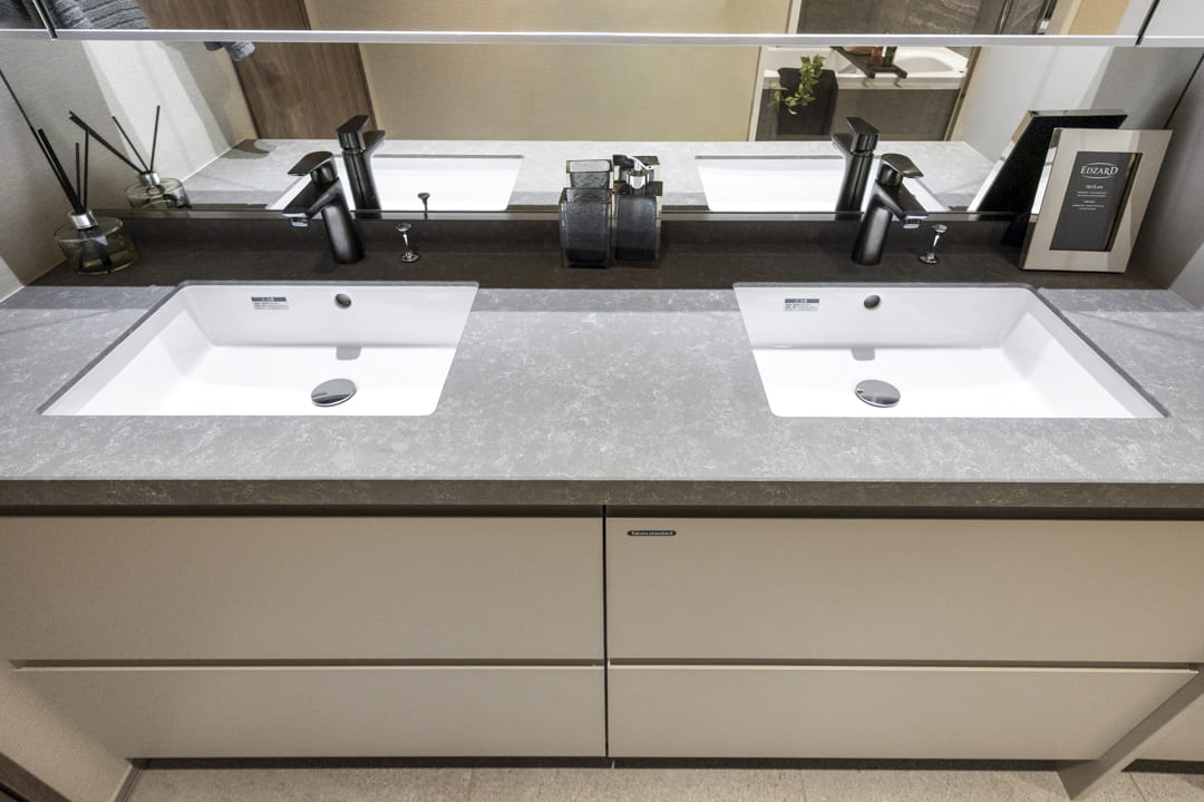 ホテルライクな2ボウル仕様の洗面化粧台。2人並んで使用でき、忙しい朝の身支度も落ち着いて行うことができます。カウンタースペースが広く、化粧品やドライヤーの仮置きができるのも嬉しいですね。リネン庫も備わっていて収納豊富◎。洗面まわりの小物からタオル・パジャマ類まですっきり収まります。