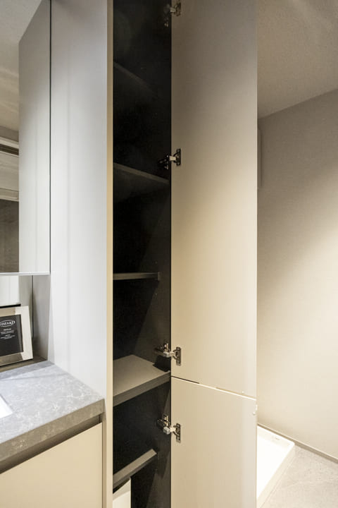 背面には収納力のあるカップボードを完備。キッチンと同じデザインで統一感があります。食料品のストックや食器類を整頓でき、いつも清潔なキッチン空間をキープできそうです。