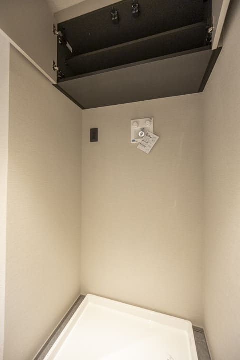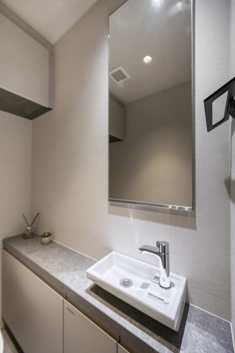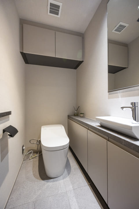 廊下に面して設けられた、独立性の高いレストルーム。スタイリッシュなタンクレストイレを採用しています。ミラー付きの手洗いカウンターを備え、来客時にもスマートにお使いいただける設え。身だしなみを整えるひとときにも配慮された、ホテルライクな空間です。吊戸棚にはトイレットペーパーや掃除用品を収納でき、生活感を抑えることができます。