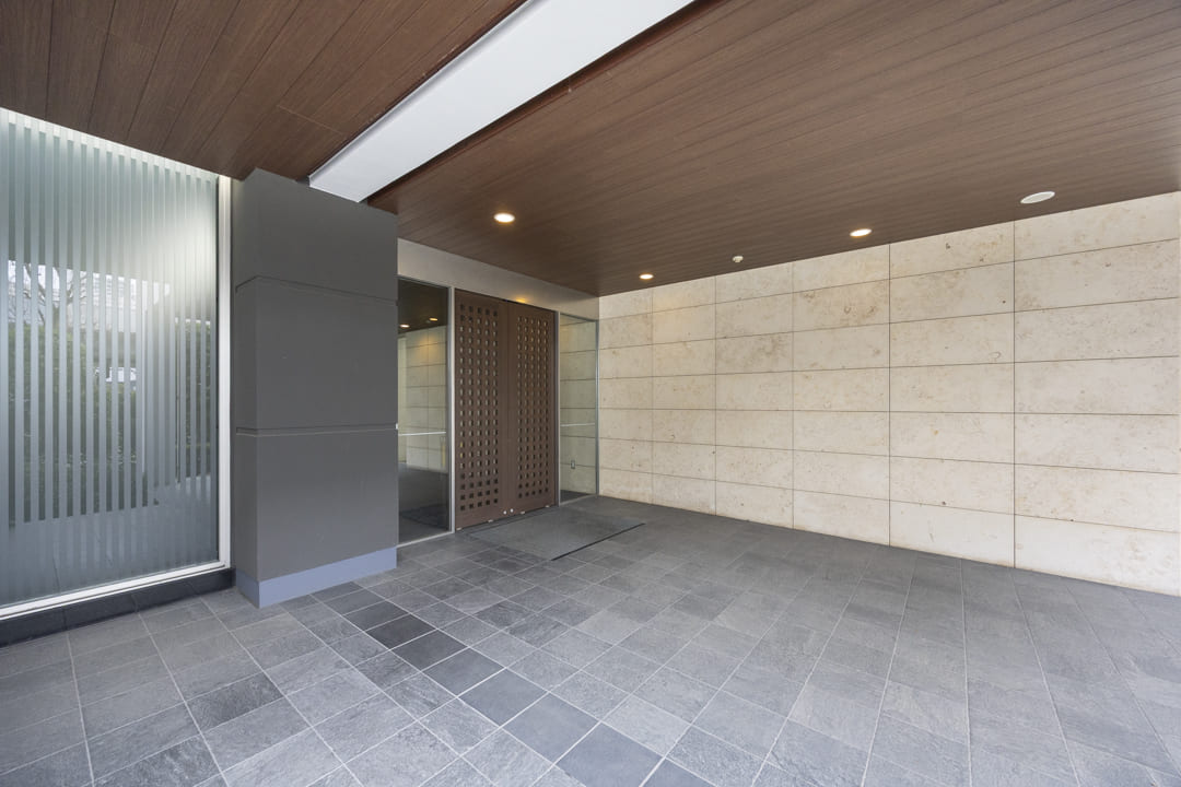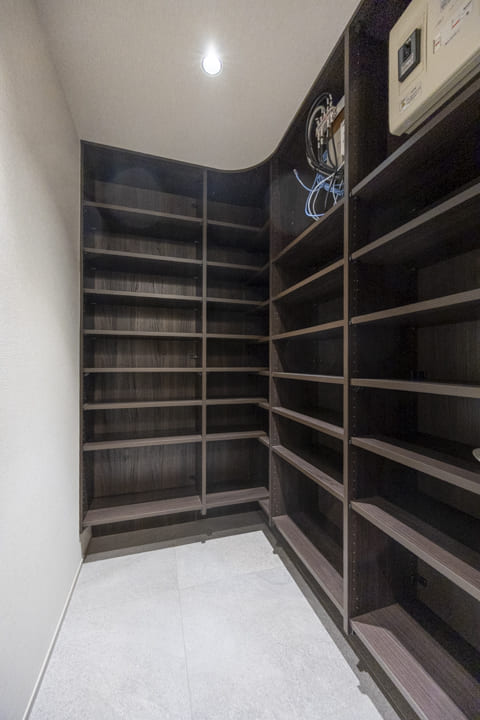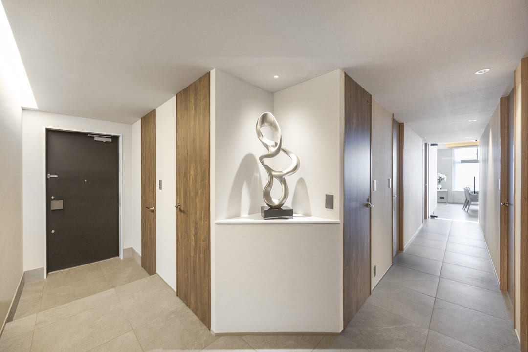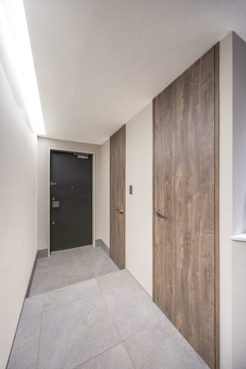 石調フロアと間接照明が上質な雰囲気を演出する玄関ホール。コーナーにはニッチカウンターが設けられ、オブジェや季節の花を飾ることで空間に彩りを添えられます。約2.1帖のSIC(シューズインクローゼット)に加え、クローゼットも備えた収納力の高さも魅力。靴はもちろん、コート類まですっきりと収まり、玄関まわりを美しく保つことができます。