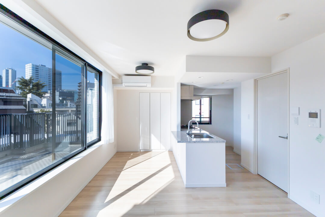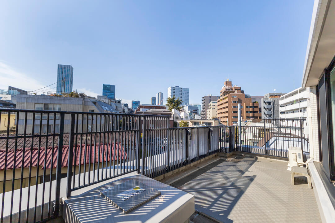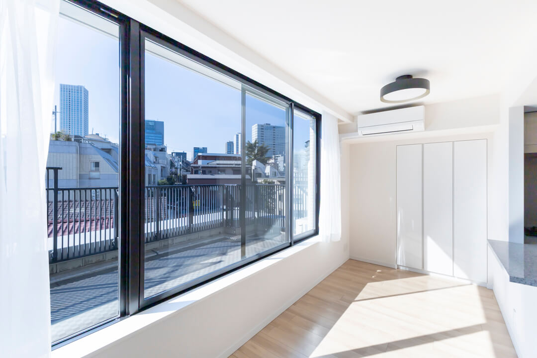 東京メトロ銀座線「外苑前」駅から徒歩10分。今回ご紹介する物件は約46㎡の1LDKです。LDKは開放感あふれる大きな窓が特徴的。夕方まで明るさが続く西向きで自然な光が入ります。窓は約20㎡のバルコニーへ通じていて、テーブルセットや観葉植物を並べたりとインテリアが楽しめそう。光と風を感じながら本を読んだり、食事をしたり、屋外というだけで心身が解きほぐれされます。