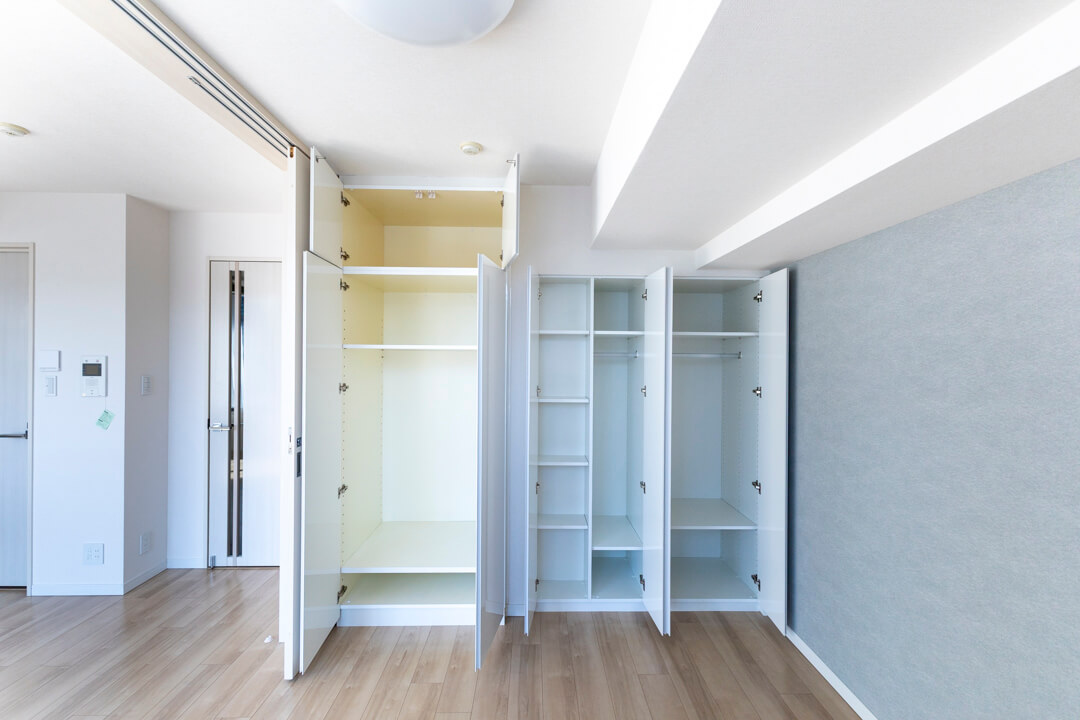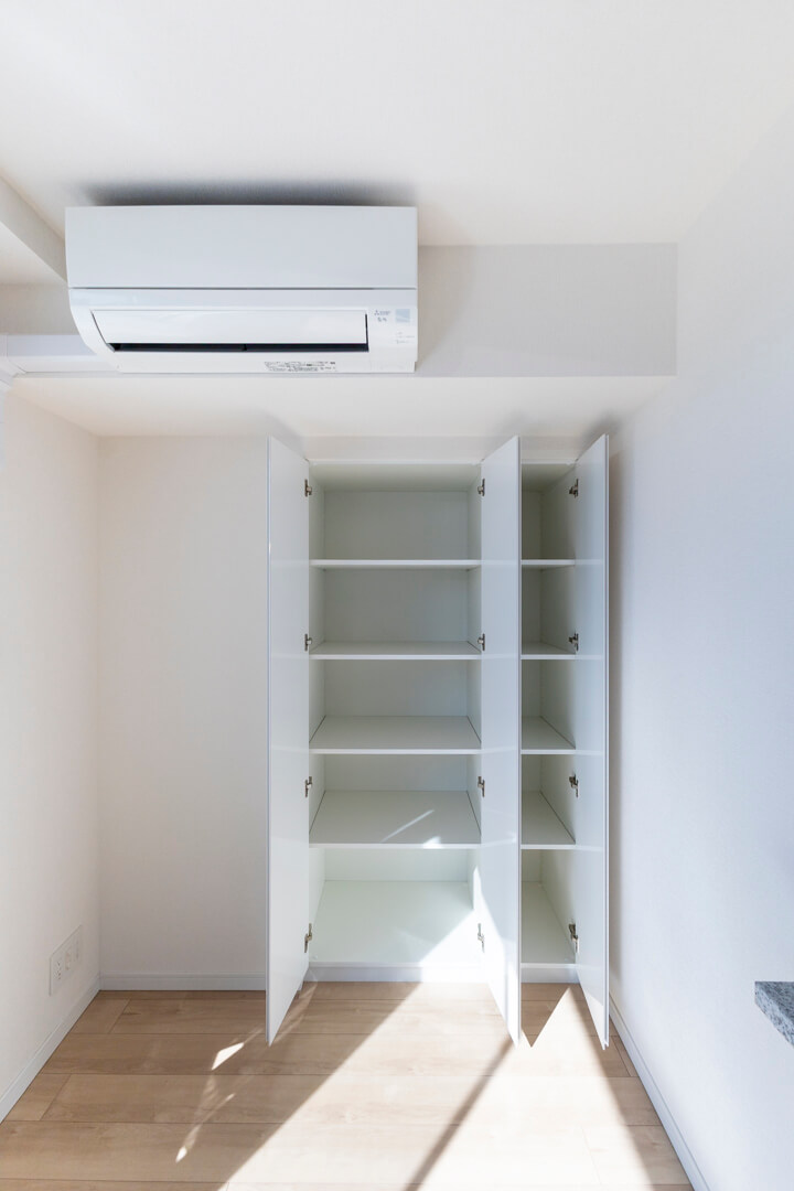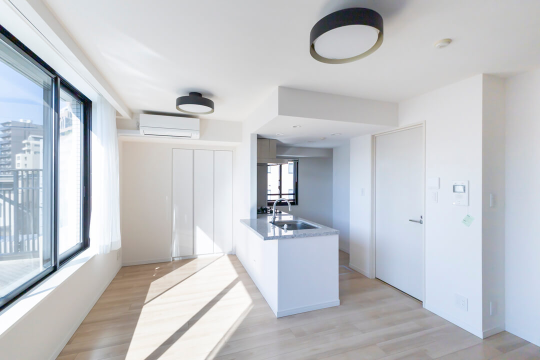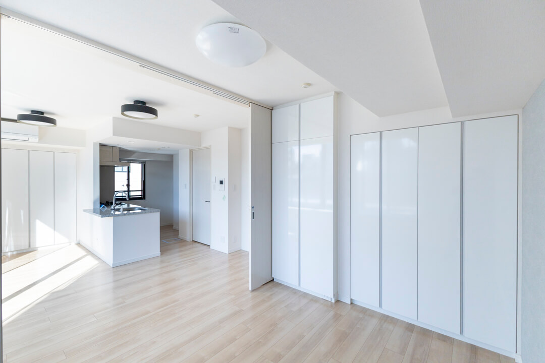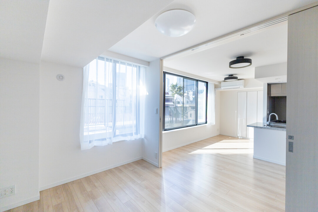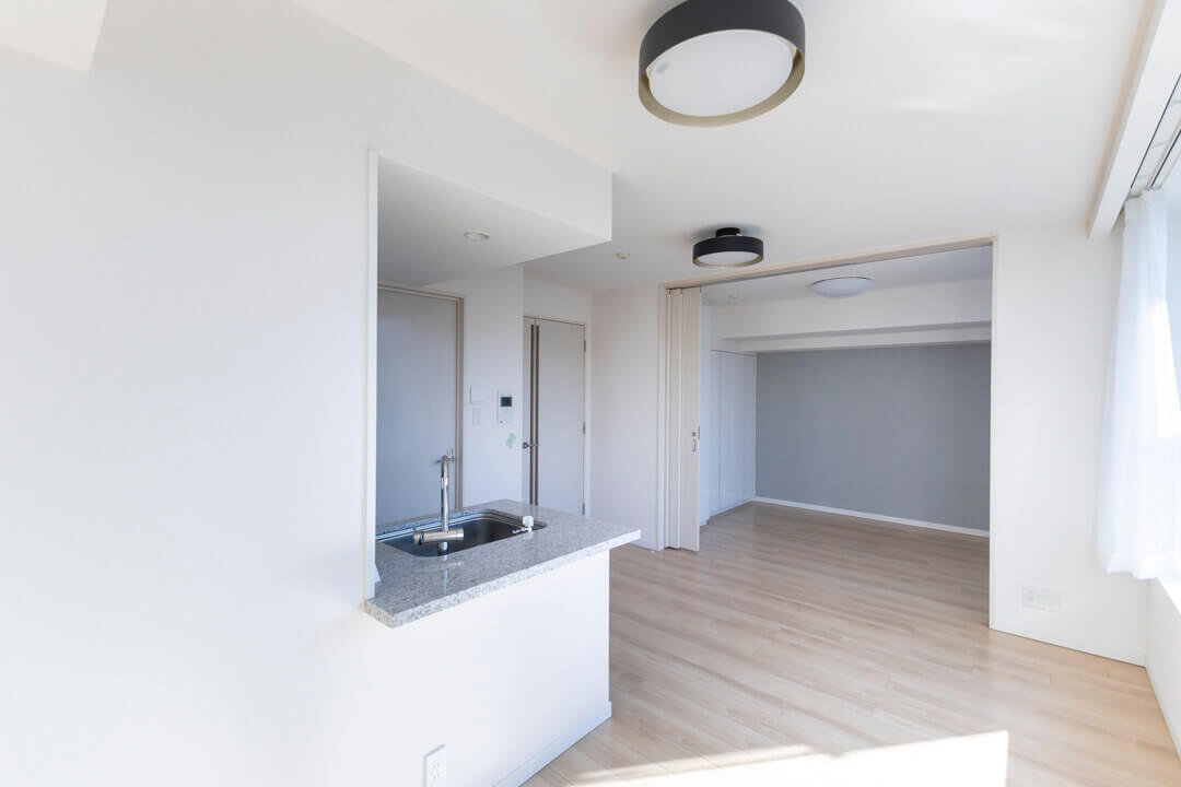 キッチンスペースを含め、約12.3帖のLDK。夕方まで明るさが続く西向きで、開放感たっぷりの大きな窓が印象的な空間です。窓は広々としたバルコニーに通じており、奥行きが感じられます。また、リビングと隣接している洋室と繋げて広々過ごすことも可能。床にドアレールがないので見た目もすっきりとした印象です。リビングの一角には収納スペースも備わっており、生活雑貨が整頓できます。