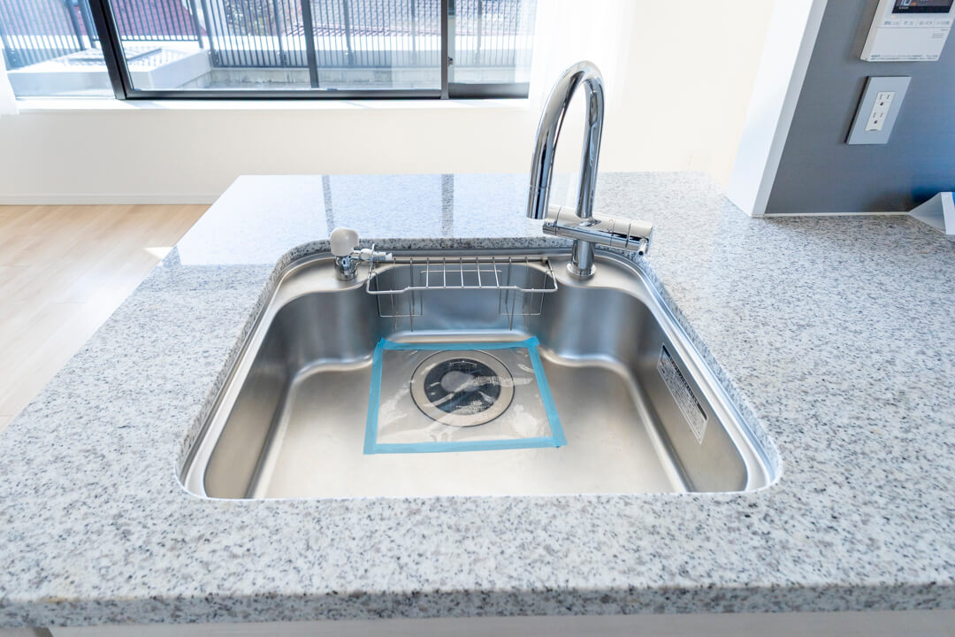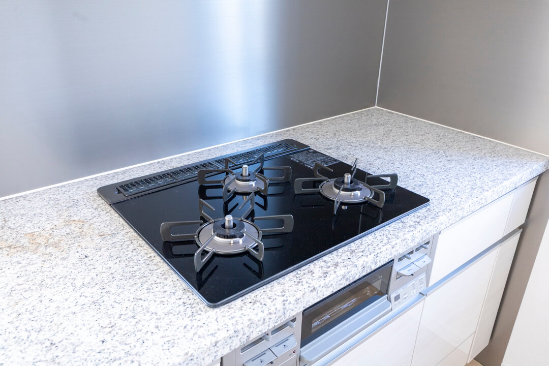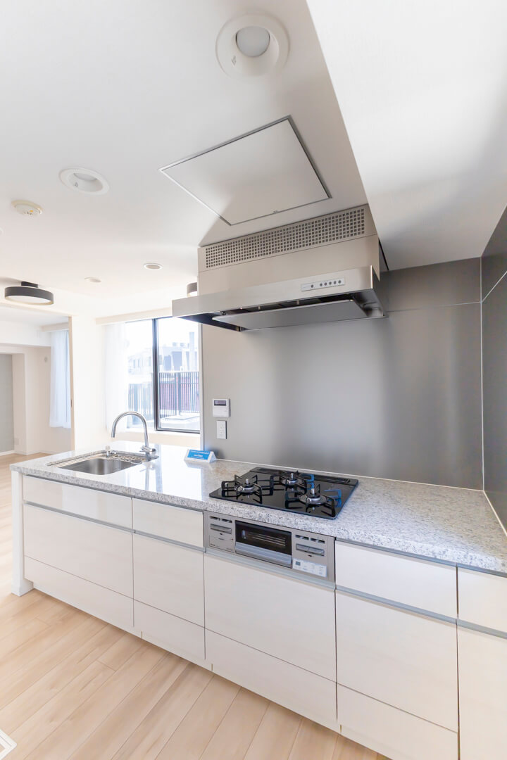家族やゲストと会話が弾む対面型のシステムキッチン。料理が捗る3口ガスコンロ、生ごみの処理に便利なディスポーザー付きです。キッチン奥には小窓も付いていて、換気もよりスムーズに行えます。