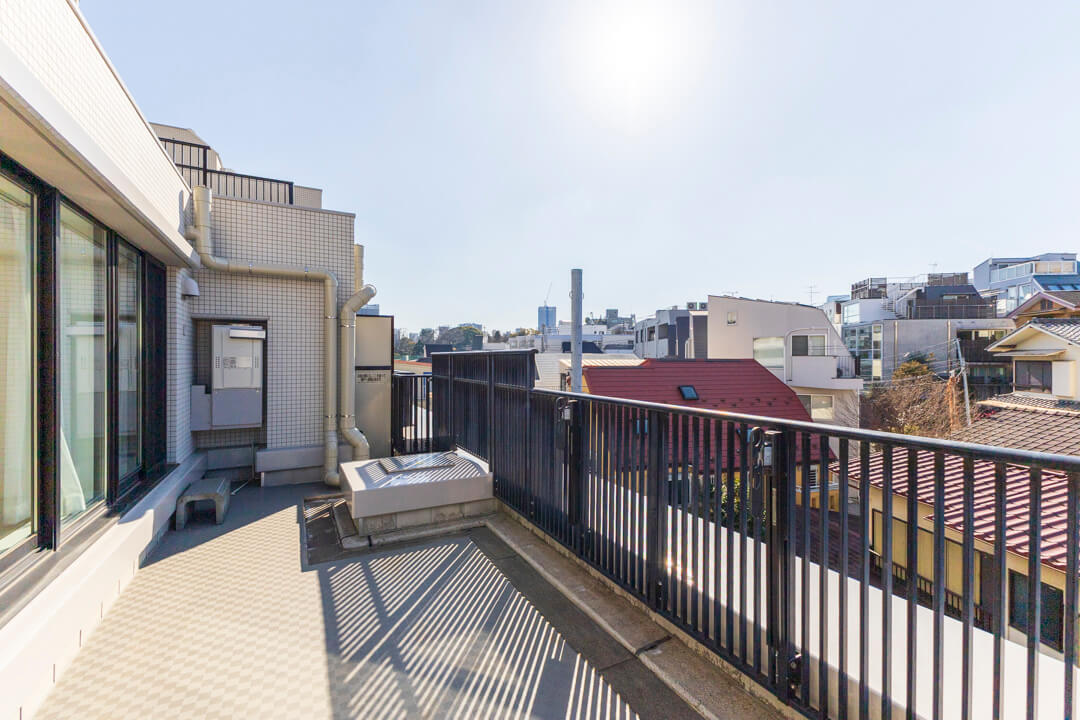 リビングダイニングと洋室に面したバルコニー。約20㎡ほどのゆとりある広さで、様々な過ごし方が可能。テーブルセットや観葉植物を並べ、第二のリビングのような使い方もできそうです。夕方まで明るさが続く西向きで、洗濯物も良く乾きそう。周辺は低層住宅が多く、見晴らしも良好です。