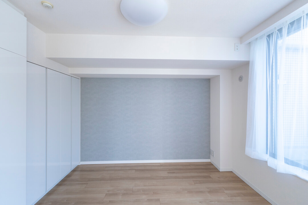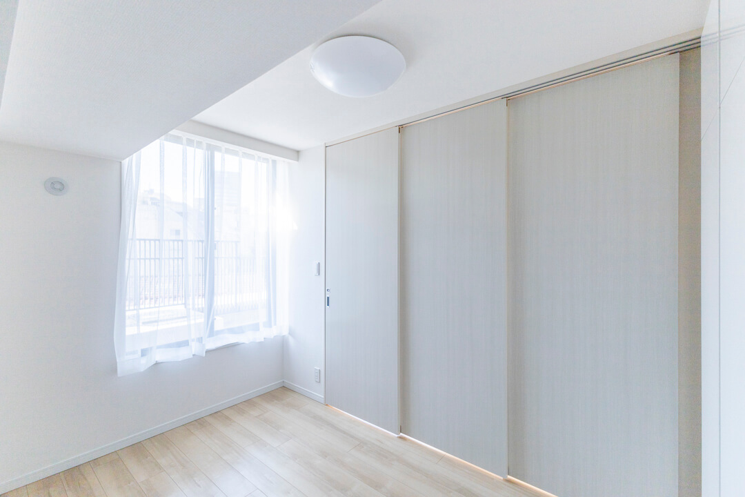 約5.6帖の洋室。リビングダイニングと繋げて広々過ごすことができます。床にドアレールがないので見た目もすっきりとした印象。レールにホコリがたまる心配もないので衛生的にも◎。クローゼットも大容量です。