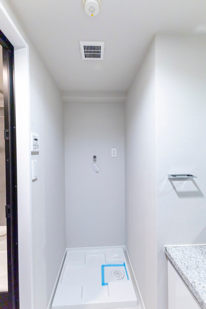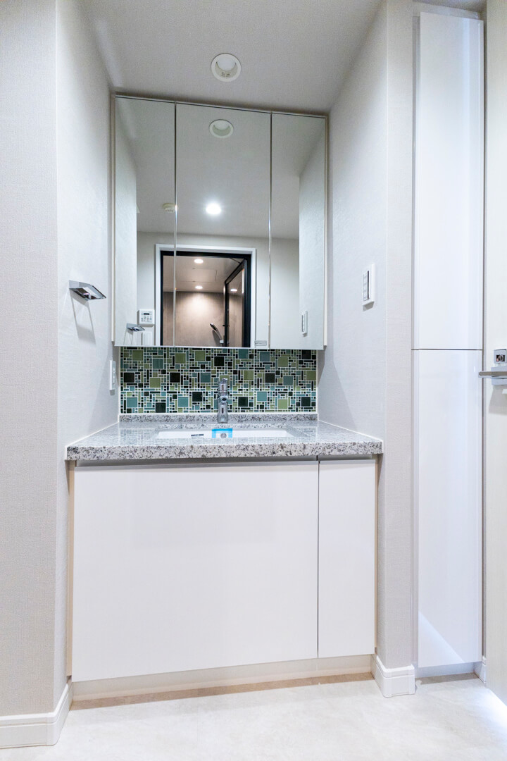 LDKから直接出入りできる洗面室。モザイクタイルが印象的な洗面化粧台は、洗面まわりの小物がすっきり整頓できるミラーボックスや、洗面下キャビネット、リネン庫付きで収納スペースがしっかりと確保されています。