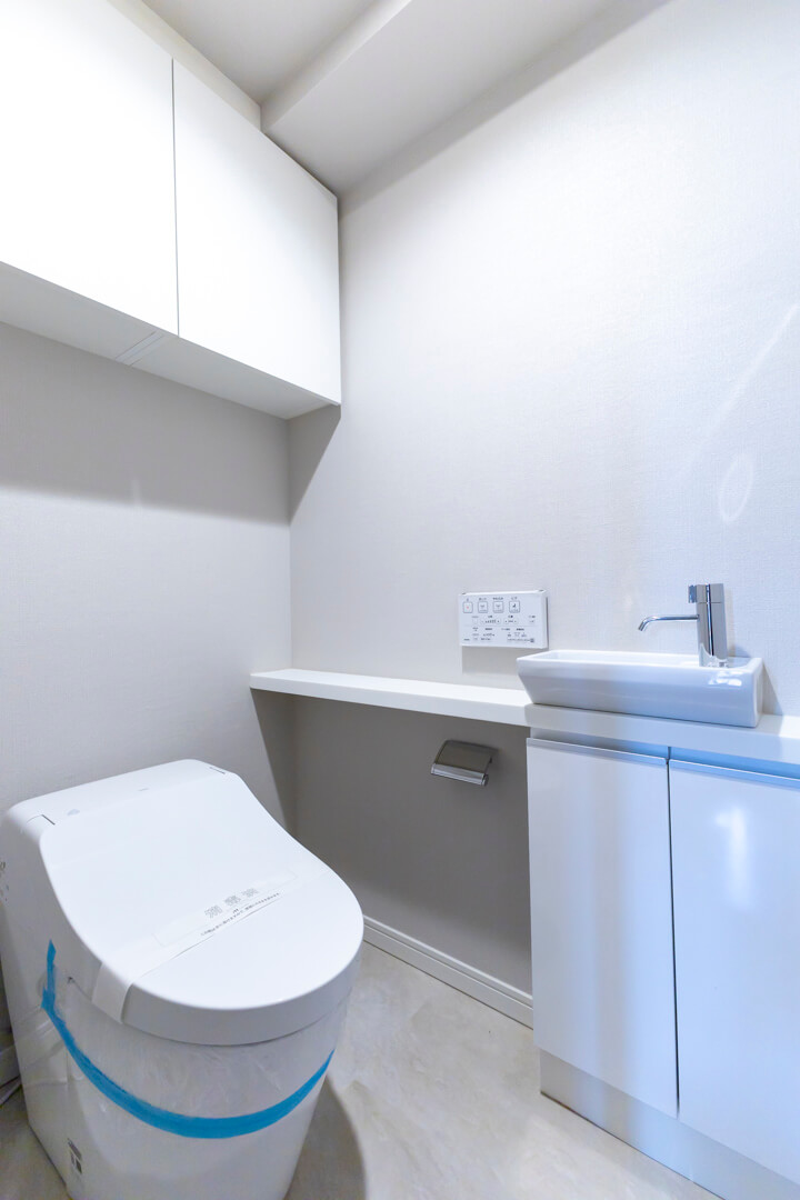 廊下に面したレストルーム。空間がすっきり見えるタンクレストイレです。手洗いカウンター、ウォシュレット、収納スペースも備わっています。