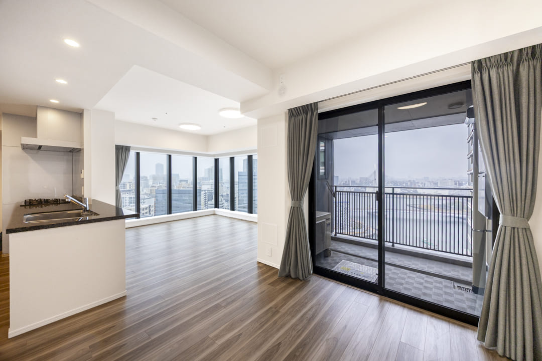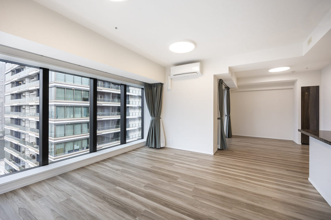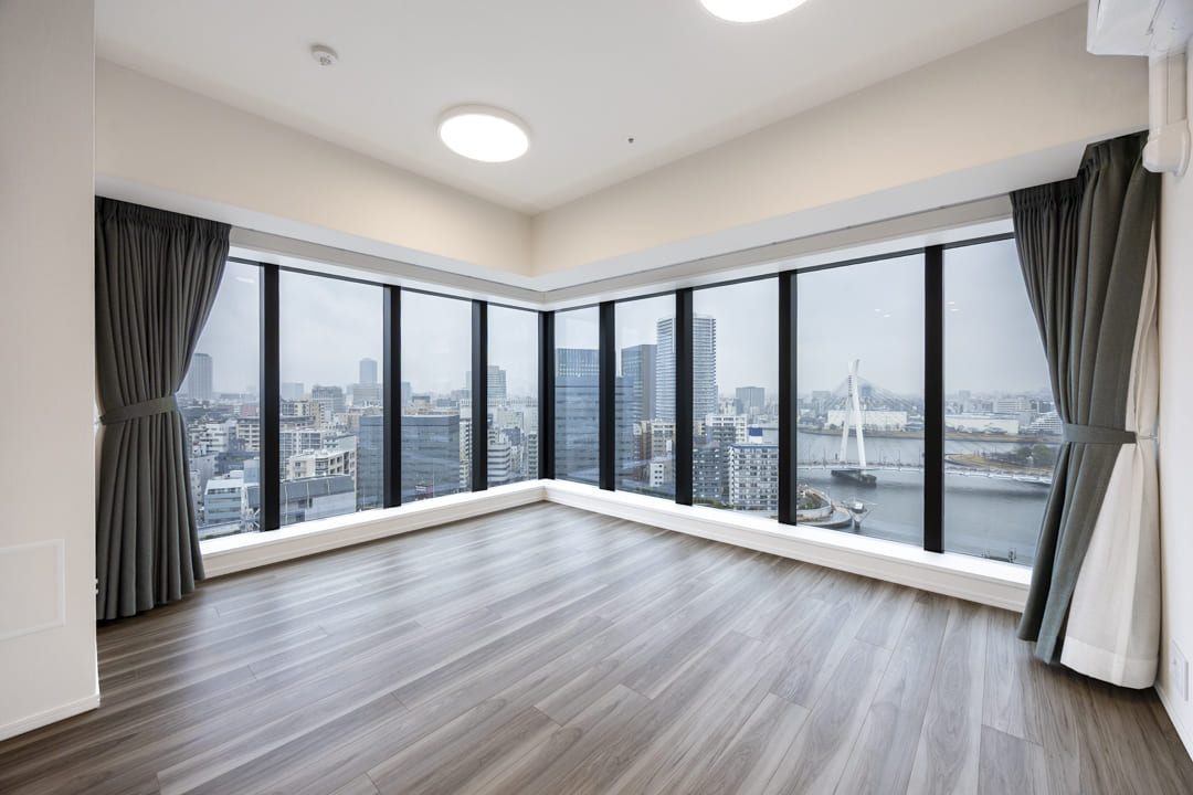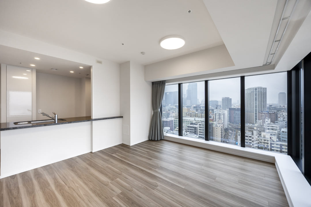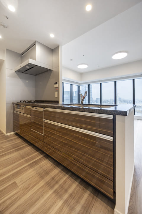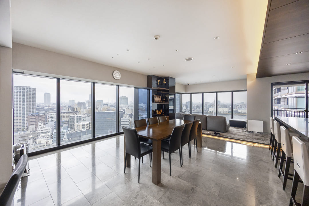 約17.1帖の広々としたリビングダイニングは、L字の窓がダイナミックな印象を演出。隅田川の潤いや中央大橋が望め、開放感溢れる空間となっています。また、リビングスペースとダイニングスペースがさりげなく分かれているので、それぞれの時間を堪能できそうです。