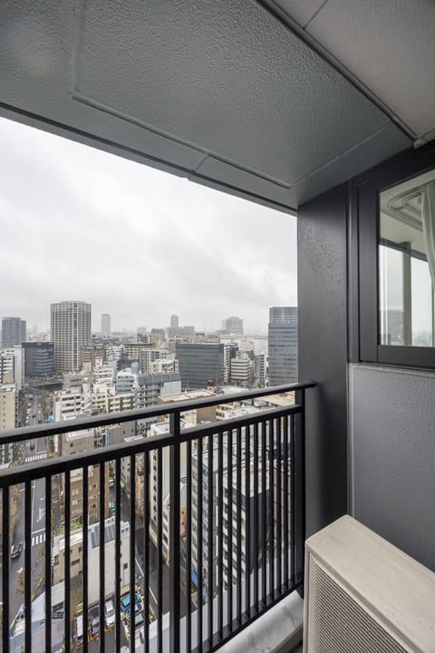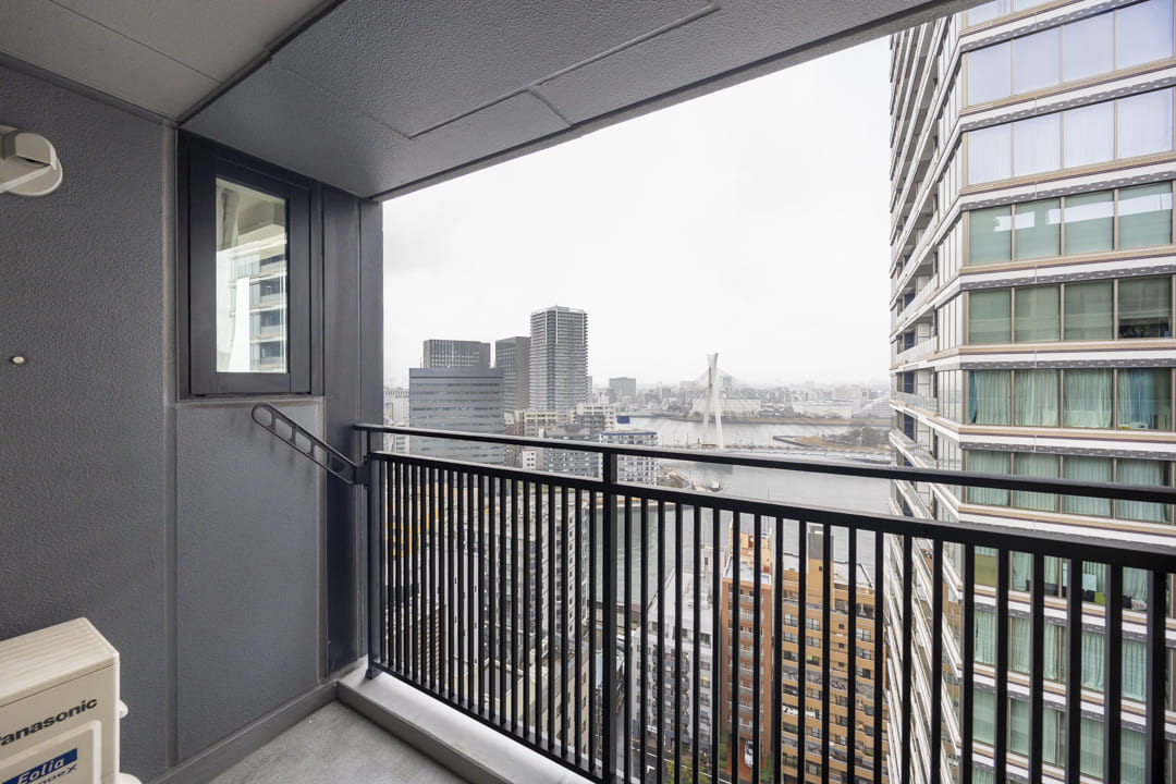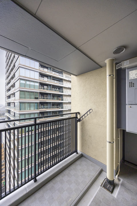 東側のバルコニーへアクセスができます。屋根がしっかりとあるタイプで、洗濯金物が設置されています。19階部分のため、時間帯によって異なる景色を楽しめそうですよ。