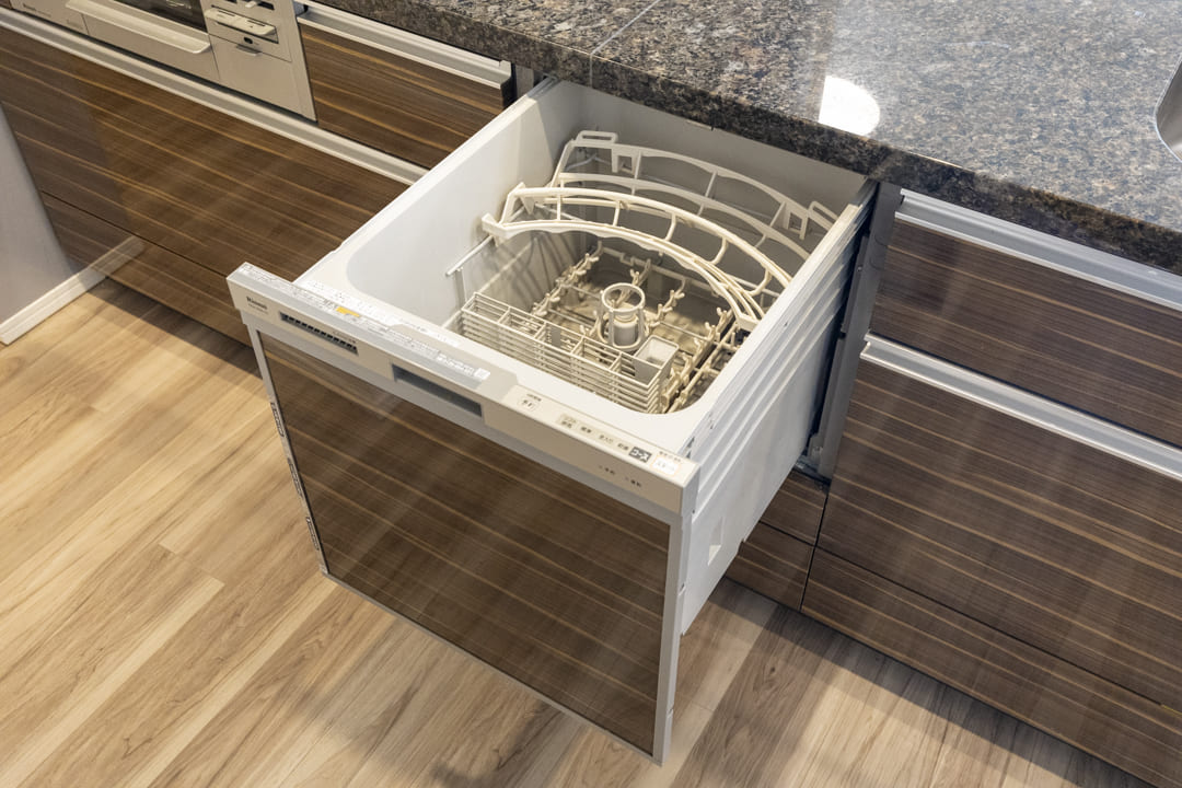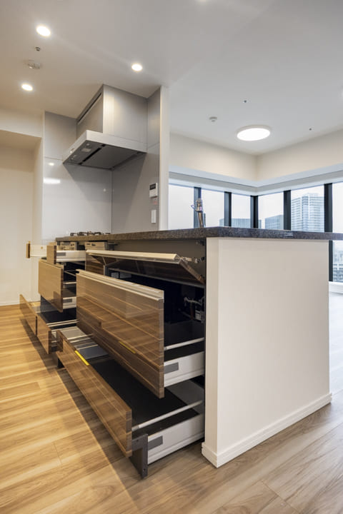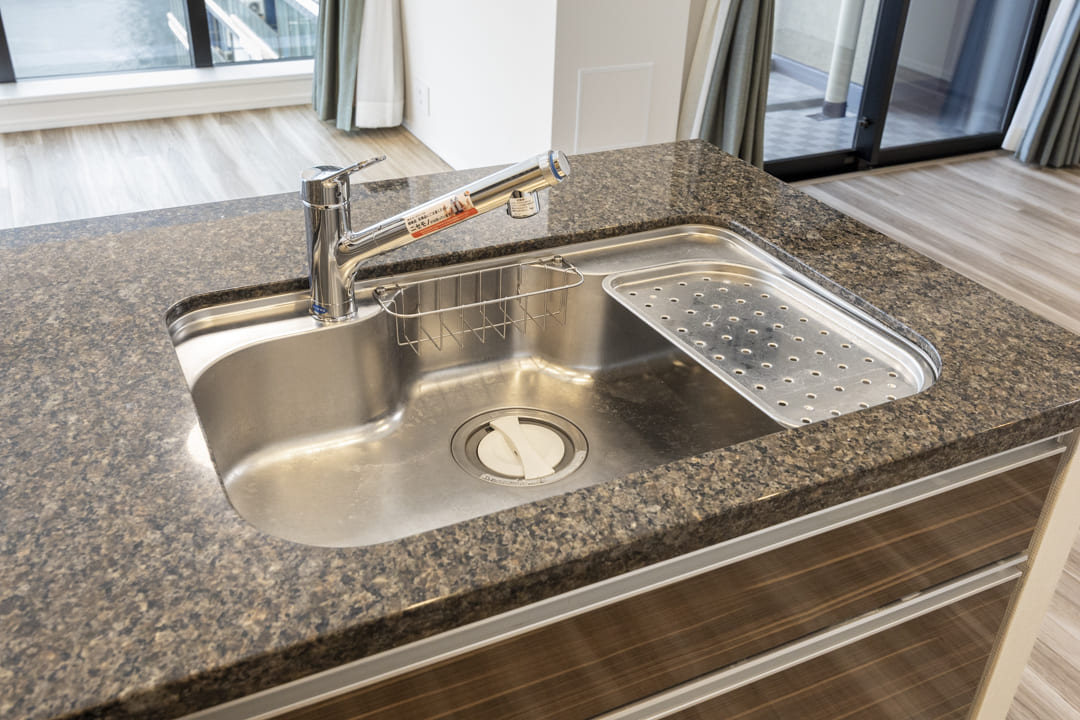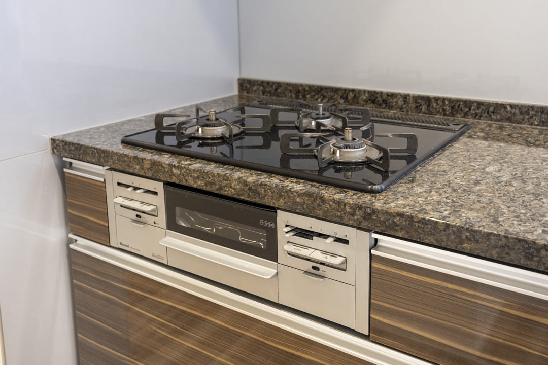 3口コンロ、グリル、ディスポーザー、食洗機付きと設備面も充実しています。シンクも広々としているので野菜などが洗いやすそうですよ。
