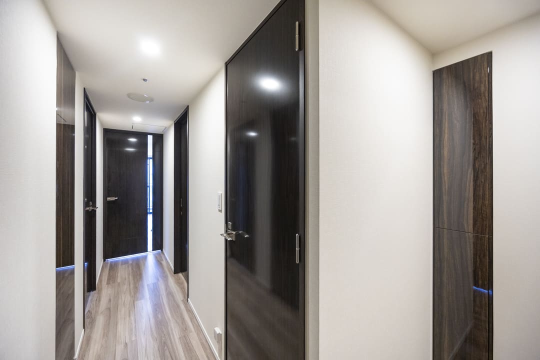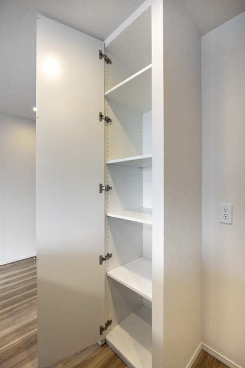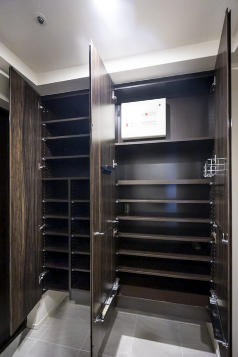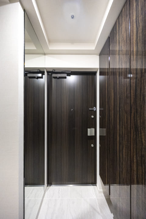 玄関入って左側にはシューズボックスが備え付けられています。高さがありますが、フロートタイプのため空間に圧迫感を与えません。たくさんの靴を収納できて便利です。また、反対側の壁面には大きな鏡が設置されています。出かける際に全身のコーディネートをチェックできるので嬉しいですね。廊下にも収納棚が造られていますよ。