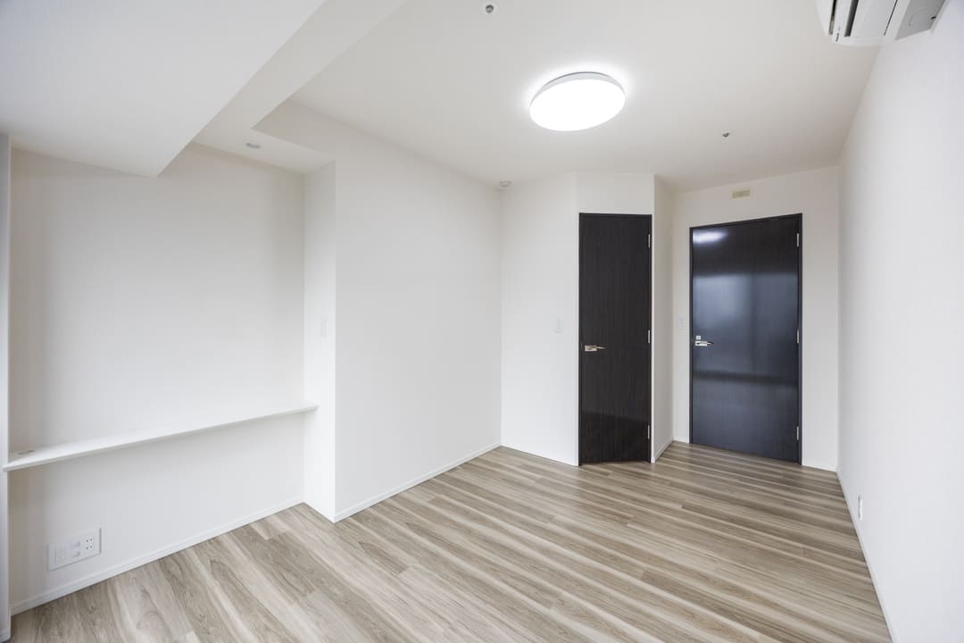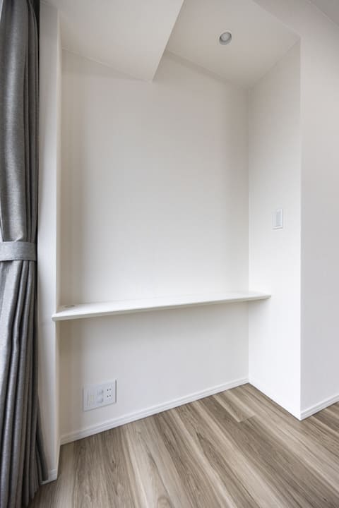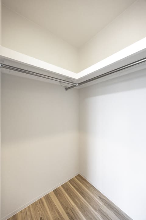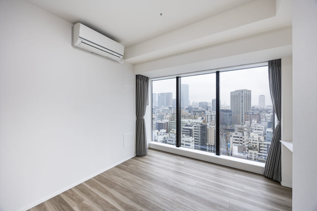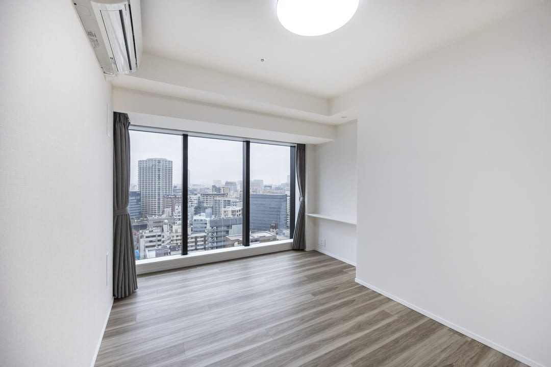約7.0帖の洋室1は、ゆとりがあって主寝室に良さそうなお部屋です。大きな窓からは抜け感のある眺望が広がっています。壁面にはカウンターが設置されているので、小物をレイアウトしたり、PC作業をしたりと便利です。また、奥行きがあるウォークインクローゼット付きのため、洋服や大きめの荷物も収納しやすくなっています。