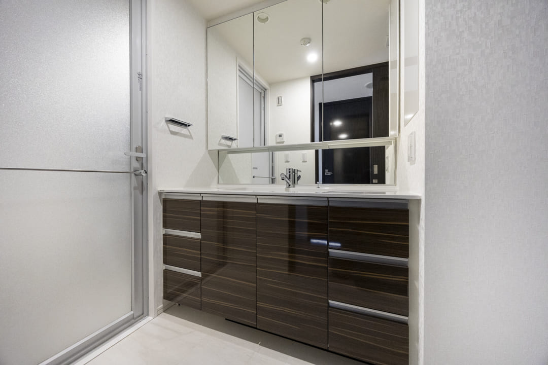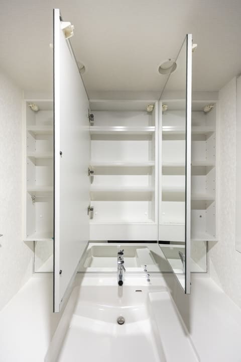 三面鏡の中には化粧品などが収納できて使い勝手良好です。水栓の背面側も鏡になっているので、座りながらでも鏡を見ることができますよ。洗面ボウルとカウンターが一体型になっているのもお手入れがしやすくて◎。